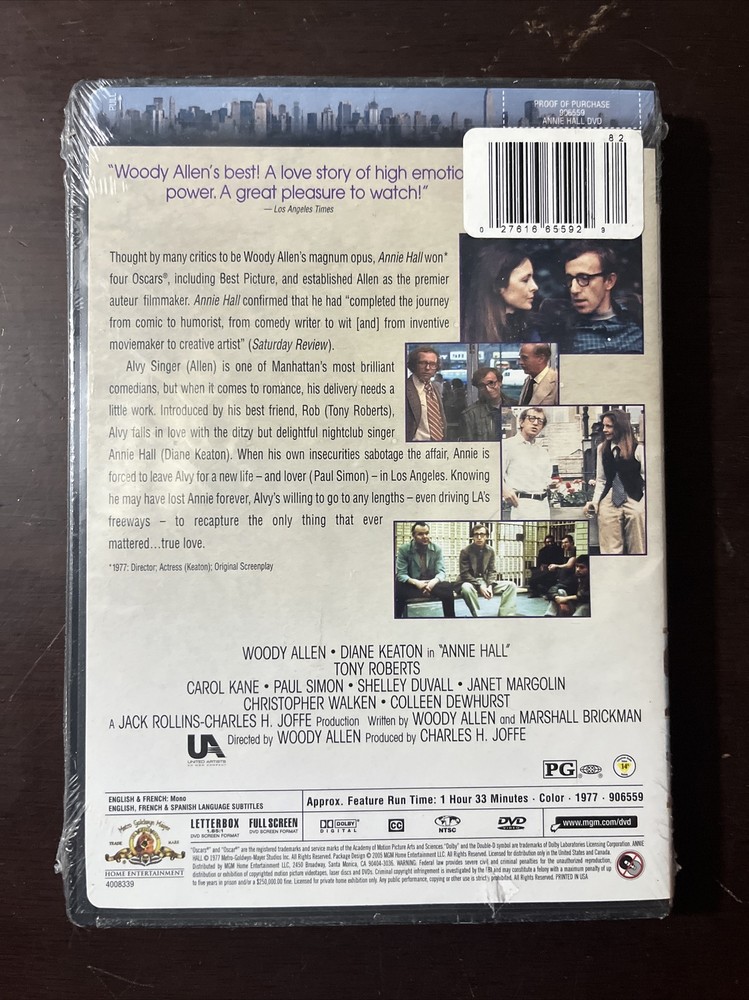 Experience the classic romantic comedy, Annie Hall, directed by Woody Allen and starring Woody Allen and Diane Keaton. This DVD version of the film is brand new and factory sealed, perfect for adding to your collection. Enjoy the witty banter and charming performances in this PG-rated film, which also features English, French, and Spanish subtitles. The Format is DVD and the Studio is MGM (Video & DVD), with producers Charles H. Joffe and Jack Rollins. Don't miss out on this timeless movie.