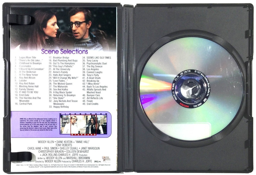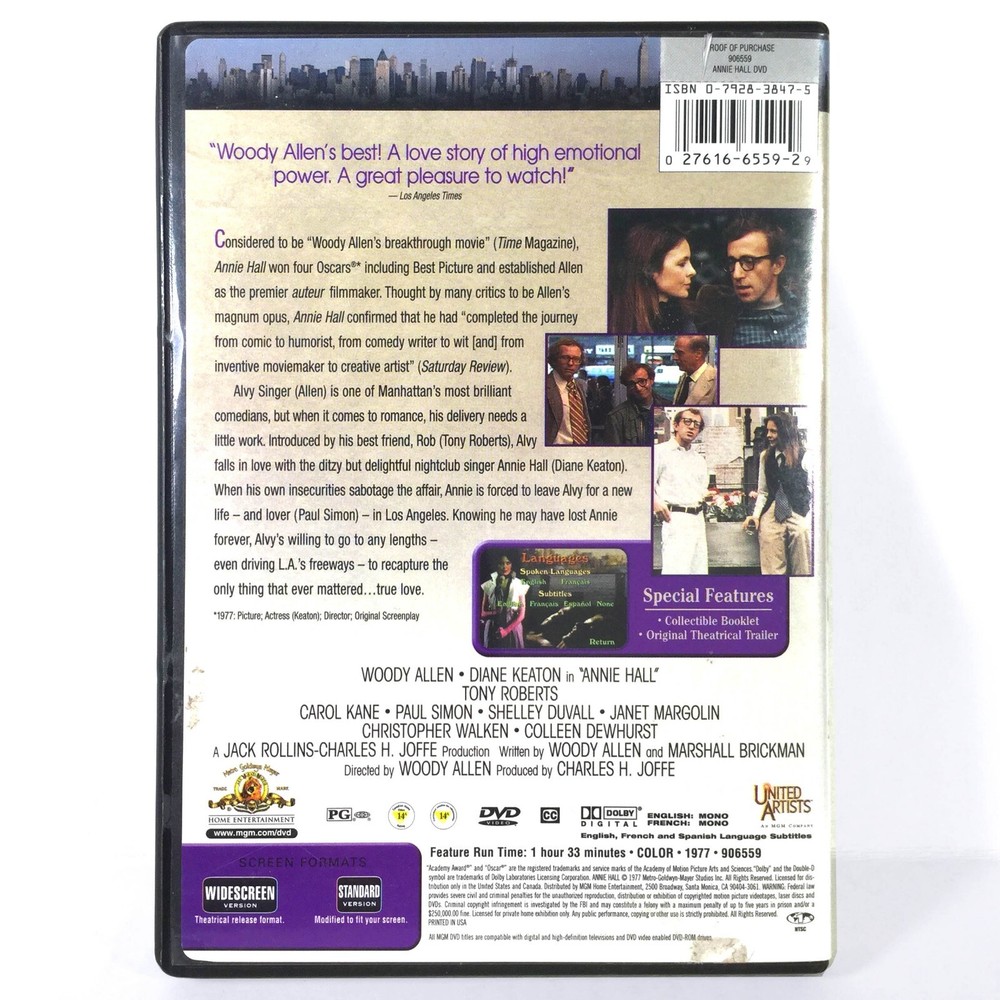 This DVD of *Annie Hall* is a great find for classic film lovers! Despite the broken hub (seller promises secure shipping) and minor shelf wear, the disc itself is authentic and in good condition. The dual widescreen & full-screen format is a nice bonus, and the star-studded cast—Woody Allen, Diane Keaton, and more—makes it a must-have. Just check the photos carefully before buying, but overall, a solid deal for fans!