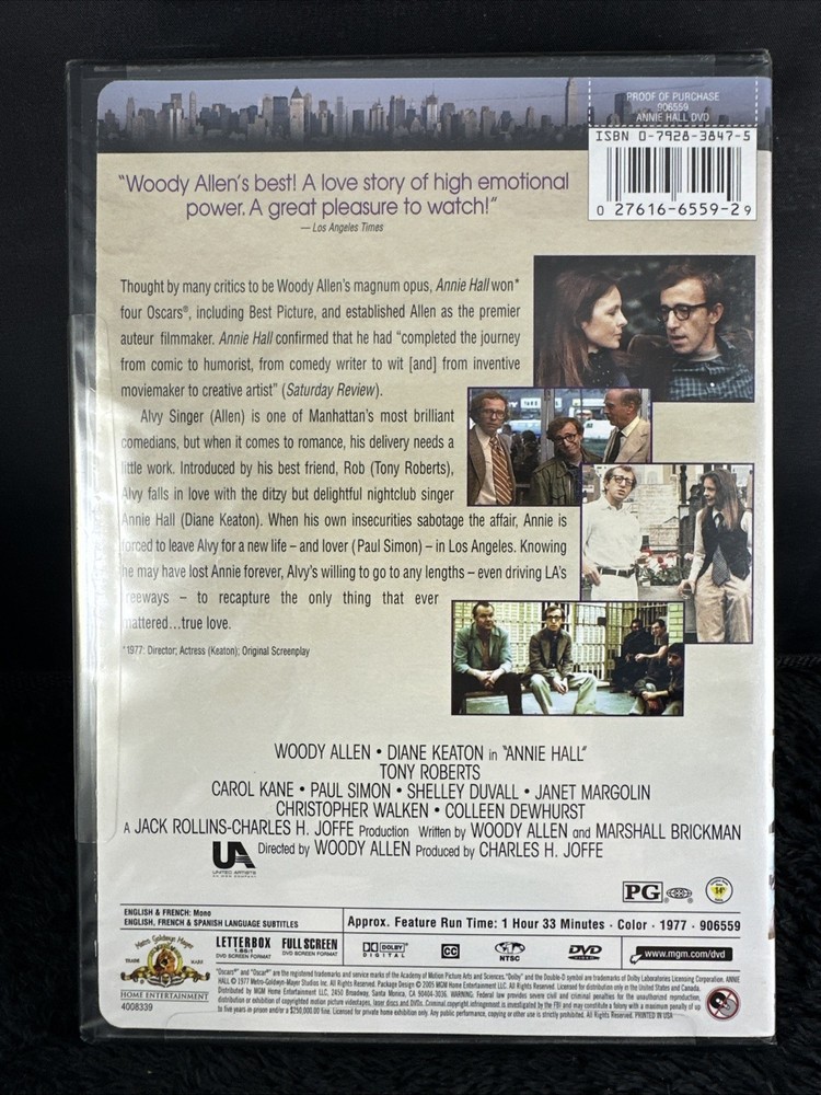 This classic film is a must-have for any movie lover. Starring the iconic Woody Allen and Diane Keaton, Annie Hall is a comedy-drama that explores the complexities of love and family. The movie is brand new and sealed in its original packaging, ready to be added to your DVD collection. With English and French language options, subtitles in English and Spanish, and a widescreen edition, this DVD has something for everyone. The film's dark humor, music, and family sub-genres make it a unique and entertaining experience. Don't miss out on the chance to own this masterpiece.