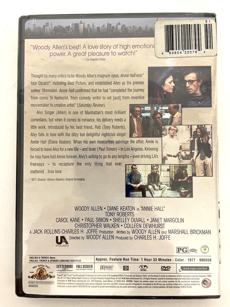 Just got this brand-new sealed DVD of *Annie Hall*—what a timeless classic! Woody Allen and Diane Keaton deliver pure chemistry in this Oscar-winning gem. The witty dialogue, sharp humor, and iconic romance make it a must-have for any film lover. Arrived perfectly sealed as described, ready to enjoy. Super happy with this purchase!