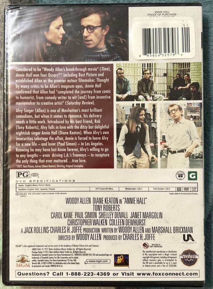 This Annie Hall DVD is a must-have for any movie lover's collection. Starring Woody Allen and Diane Keaton, this classic comedy is a timeless masterpiece that will leave you laughing out loud. The DVD is in the NTSC video format and has a region code of DVD: 1 (US, Canada...). The case type is a standard jewel case and the rating is PG. The movie is in English language and was manufactured in the United States by MGM Home Entertainment. This item is categorized under Movies & TV and DVDs & Blu-ray Discs. Get your hands on this highly sought-after DVD today and enjoy the hilarious antics of Annie Hall and Maxwell Sheffield.