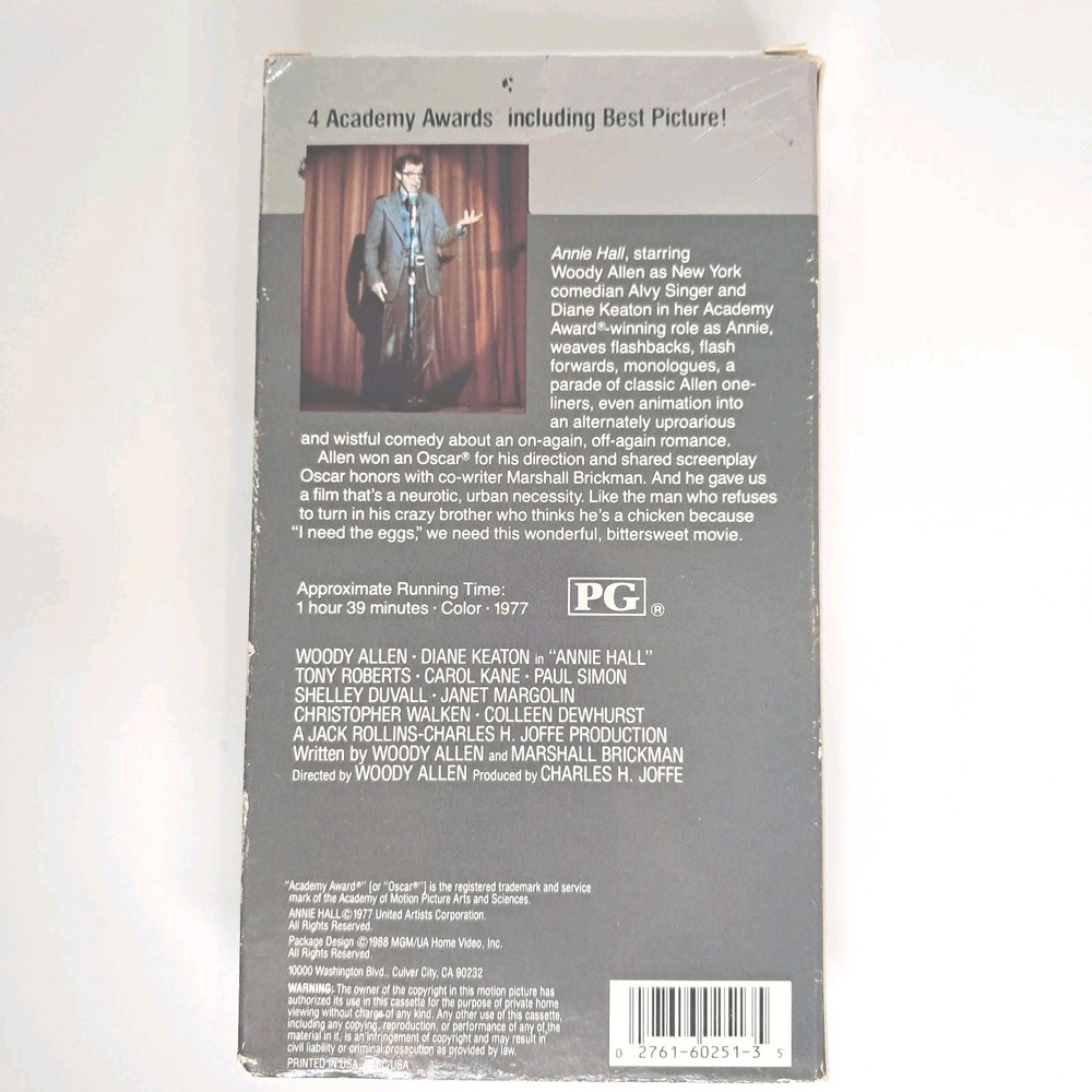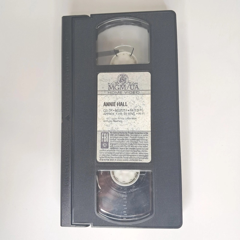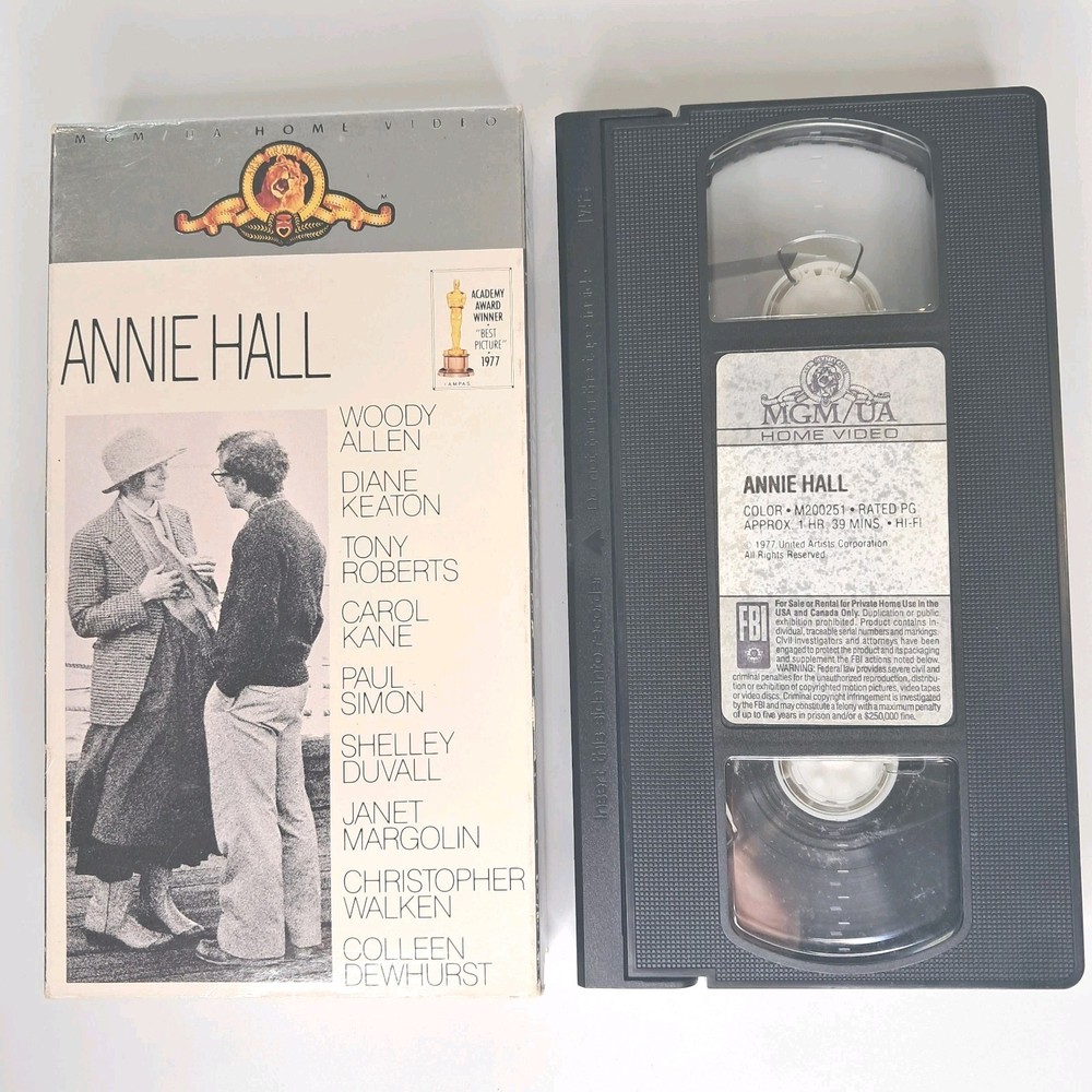 Annie Hall Movie VCR VHS Tape 1977 Rated: PG, 1 hr 39 min, Genre: Comedy, Romace. Actors: Woody Allen, Diane Keaton, Tony Roberts, Carol Kane, Paul Simon, Shelley Duvall, Janet Margolin, Christopher Walken, Colleen Dewhurst. Measures: 7 1/2 inch high x 4 1/4 inch wide x 1 inch high. Weighs: 8.5 ounce. Buying: We realize you are buying without the benefit of a physical viewing. As a result we strive to show the most representative photographs and provide description and condition copy as accurately as possible. A careful buyer, someone who will take the time to review each photograph, read the description and condition copy, and ask us pertinent questions, is our most valued customer. We include only that which is found in the listing photos. Shipping: Shipping quotes include all postage, packing, handling, and insurance. Everything you purchase will be professionally packaged in a sturdy, safe manner for secure shipping from our location to yours. Returns Policy: United States returns are accepted per eBay's guidelines. Please contact us first to open a dialogue. Most concerns will likely be resolved more quickly and satisfactorily at this stage for all involved before any other action is taken. International Shipping: International buyers are responsible for all tax, duty and custom fees. We appreciate our buyers! Thank you for shopping at ImagePlans , our ebay store. Take a moment to see our many other items currently listed for sale. ImagePlans is located in Fairfield County, Connecticut, where we search for well-designed, quality items at neighboring estates sales. We mostly carry vintage, antique, used, and pre-owned items that are sold as is, as found. We ask that you carefully review our product photos and description & condition copy.