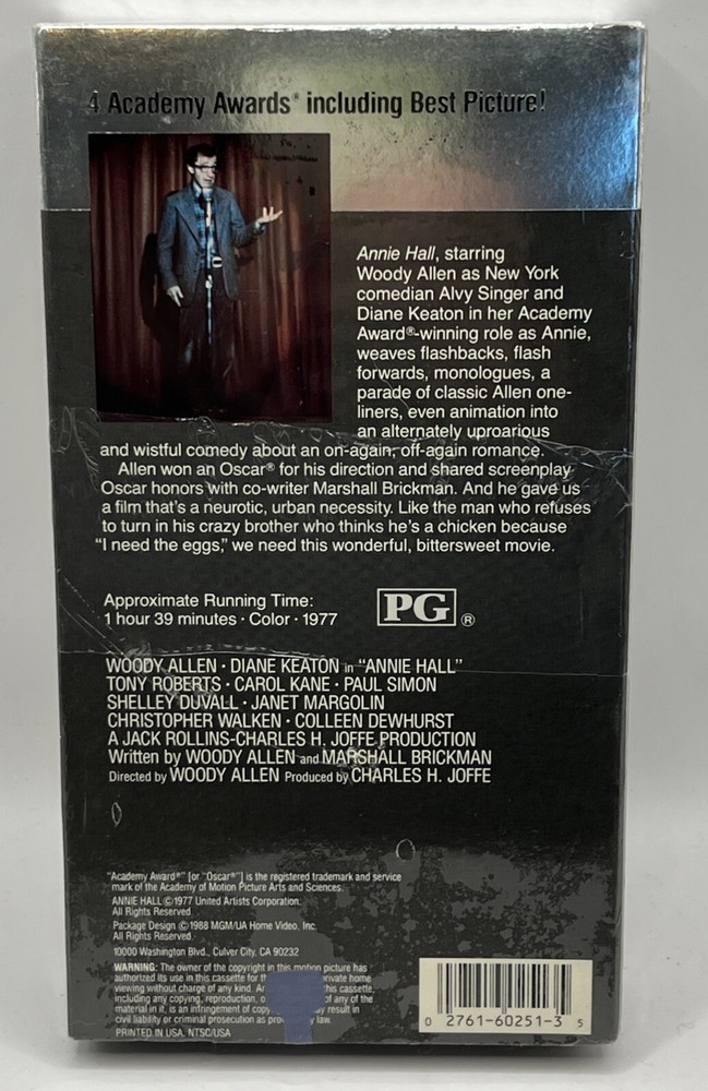 The product is a VHS tape of the movie "Annie Hall" directed by Woody Allen, featuring a leading role by Diane Keaton. It falls under the Comedy genre with a sub-genre of Classical. This contemporary classic edition of "Annie Hall" offers viewers a nostalgic viewing experience of the iconic film on VHS format. RARE VHS Tape GREAT Collectible for ANYONE interested in Vintage VHS Tapes! For additional information or photos, please feel free to contact me and I will be more than happy to provide you with assistance:) Condition is “Brand New”. Shipped with USPS Media Mail.