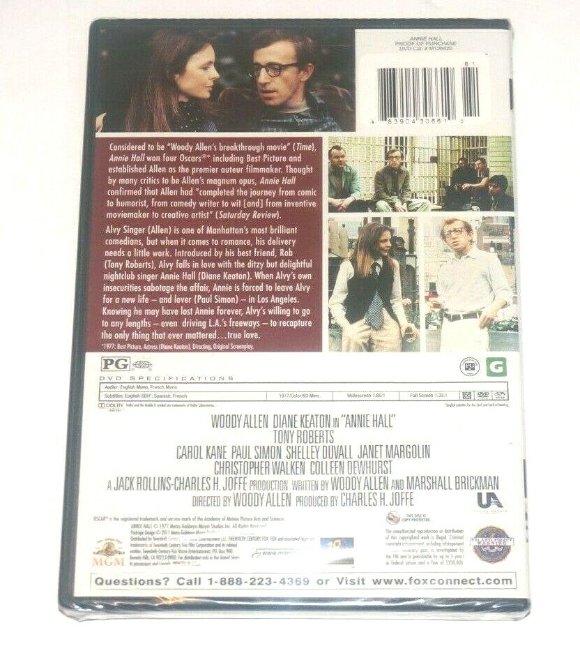 ANNIE HALL WIDESCREEN & FULL SCREEN DVD Item Description ANNIE HALL WIDESCREEN & FULL SCREEN DVD Actors: Woody Allen , Diane Keaton , Tony Roberts , Carol Kane , Janet Margolin Directors: Woody Allen Format: Multiple Formats, Closed-captioned, Color, Full Screen, Letterboxed, NTSC, Subtitled, Widescreen Language: English (Dolby Digital 2.0 Mono), French (Dolby Digital 2.0 Mono) Subtitles: English, Spanish, French Region: Region 1 Aspect Ratio: 1.66:1 Number of discs: 1 Rated: PG Studio: 20th Century Fox Run Time: 93 minutes Payment Policy We accept payment by any of the following methods: PayPal Please pay as soon as possible after winning an auction, as that will allow us to post your item to you sooner! Shipping Policy Your order will be dispatched within 1 working day of receiving payment (Monday-Friday) and you should expect to receive it one or two days after dispatch (for orders sent RM 1st Class). In the very unlikely event that your item is lost or damaged during post, then WE are responsible and will issue either a full refund or replacement. Returns Policy If you are not 100% satisfied with your purchase, you can return the product and get a full refund or exchange the product for another one, be it similar or not. You can return a product for up to 14 days from the date you purchased it. Any product you return must be in the same condition you received it and in the original packaging. Please keep the receipt.