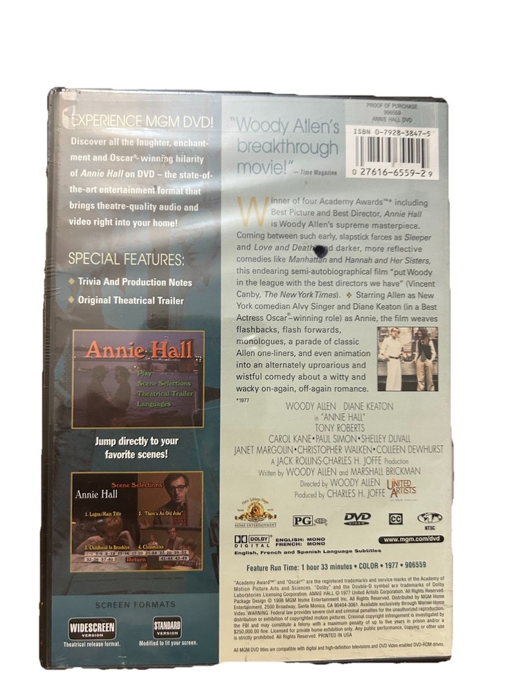 Annie Hall is a classic comedy film directed by Woody Allen and starring Diane Keaton. The movie follows the story of a comic strip artist named Annie Hall and her relationship with a stand-up comedian named Alvy Singer. The film is rated PG and has a runtime of 93 minutes. It is available in English and French languages and is region-coded for DVD: 1 (US, Canada...). The aspect ratio is 4:3 and it is in the Standard Edition. The producers of the film are Charles H. Joffe and Jack Rollins. The movie is a contemporary comedy genre and is available in DVD format.