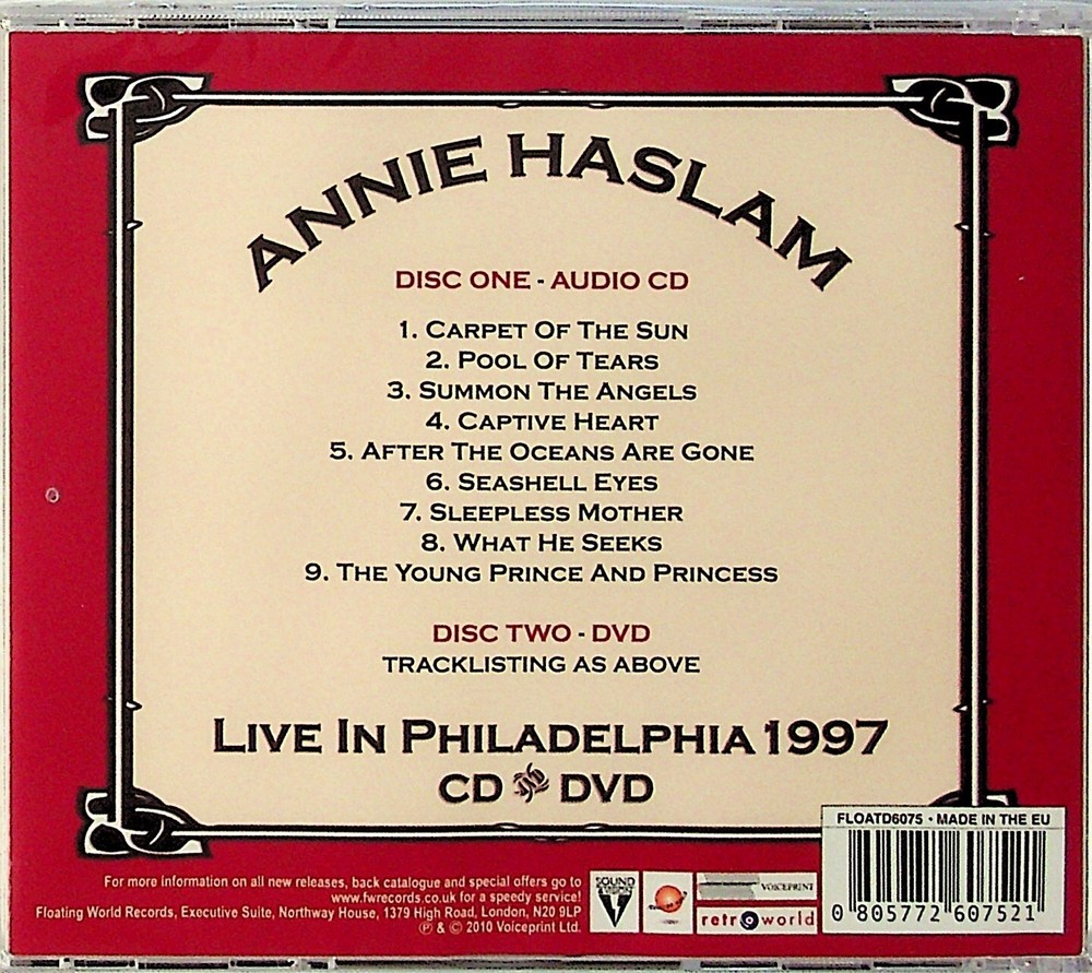 OUR REF - C 67872 Annie Haslam – Live In Philadelphia 1997 CD & DVD (NEW 2010) Renaissance * CONDITION NOTES NEW SEALED POSTAGE DISCOUNTS- BUY MORE AND SAVE ON SHIPPING COSTS! THE FIRST ITEM IS FULL PRICE POSTAGE & EACH ADDITIONAL ITEM IS HALF PRICE POSTAGE*. THE 'FIRST' ITEM WILL BE THAT WITH THE HIGHEST POSTAGE COST IN ANY ORDER (*NOTE- SOME VINYL BOX SETS MAY BE EXCLUDED FROM THIS DEAL DEPENDING ON WEIGHT) CUSTOMERS IN THE U.S. - ALL SHIPPING IS NOW TRACKED AS STANDARD BUT BETTER SHIPPING DISCOUNTS ON MULTIPLE ITEM ORDERS ARE AVAILABLE. PLEASE REQUEST AN INVOICE BEFORE CHECKOUT. YOU CAN CONTACT US FOR THE BEST RATES BEFORE MAKING AN ORDER UK CUSTOMERS - IF MAKING A LARGE ORDER PLEASE REQUEST AN INVOICE BEFORE CHECKOUT AS WE MAY BE ABLE TO OFFER BETTER POSTAGE DISCOUNTS PLEASE CONTACT US USING EBAY MESSAGES IF YOU HAVE ANY QUERIES BEFORE OR AFTER YOUR PURCHASE. WE WILL REPLY AS SOON AS POSSIBLE BUT MAY NOT ALWAYS BE ABLE TO RESPOND AT WEEKENDS. WE TAKE GREAT CARE IN OUR LISTINGS BUT IF ANY ITEM FALLS BELOW YOUR EXPECTATIONS THEN PLEASE CONTACT US & WE WILL BE GLAD TO HELP. Powered by SixBit's eCommerce Solution