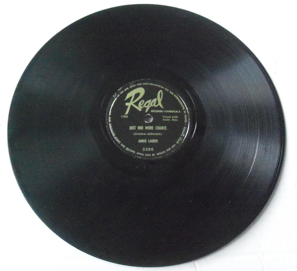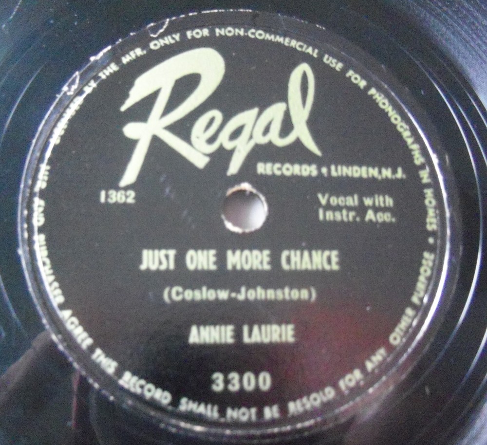 Up for sale is a hard to find single (10 inch, shellac, 78 rpm) record featuring a much under-appreciated African American rhythm and blues singer. Record Label: Regal Records (Linden, New Jersey) Record Number: 3300 Year of Release: 1950 Artist: Annie Laurie One side (1362): Just One More Chance (Coslow - Johnston) (Merit - BMI) Vocal with Instr. Acc. Wax Matrix marks: "R1362" (stamped) and "D" (etched) Other side (1363): Now That You're Gone (Seigel - Madison - Biggs) Vocal with Instr. Acc. Wax Matrix marks: "R1363" (stamped) Annie Laurie (1924 - 2006) was born in Atlanta, Georgia. She began performing in territorial bands and - about 1945 - relocated to New Orleans where she was engaged to bandleader Paul Gaytan. She recorded for Regal Records between about 1947 and 1951, singing on sides backed with Gaytan's orchestra. Subsequently, she sang on the Okeh and Savoy labels. Perhaps her biggest hit was It Hurts to Be in Love , on the DeLuxe label. In 1962, she left the music industry entirely to devote herself to the Jehovah's Witnesses. (NOTE: Annie Laurie, the R&B singer, should not be confused with the traditional Scottish ballad or the 1927 silent movie starring Lillian Gish, both of the same name.) Just One More Chance , in a more traditional arrangement, was Bing Crosby's first big recorded hit, in 1931. Please see above for full description of condition and for photos. Sold as is. Attention US Buyers: I will ship by USPS Media Mail or by USPS Priority Mail, your choice. Please note that if you have a Military Mail (e.g. APO) address, I must ask that you pick USPS Priority Mail as it is my understanding that USPS Media Mail is not reliable to Military Mail addresses. Attention International Buyers: I am exclusively using e-Bay International Shipping. If you win this auction, I will ship it to an e-Bay facility in the United States. e-Bay will be responsible for sending it to your international address. Please familiarize yourself with e-Bay International Shipping before bidding. Thank you.