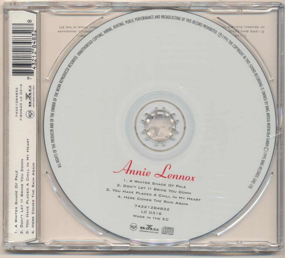 Annie Lennox Maxi-Single CD with the tracks "A Whiter Shade Of Pale / Don't Let It Bring You Down (LIVE) / You Have Placed A Chill In My Heart (LIVE) / Here Comes The Rain Again (LIVE)." The CD is new, still SEALED from 1995. It was obtained from a record store going out of business several years ago. Shipping: I ship to specific countries. Shipping outside the U.S.A. is dependent upon weight and location. If you are purchasing more than one item from outside the U.S.A., I recommend requesting an invoice as I combine items to reduce the cost of shipping.
