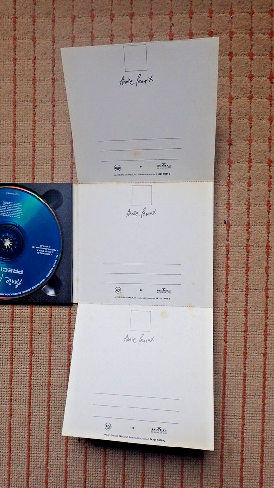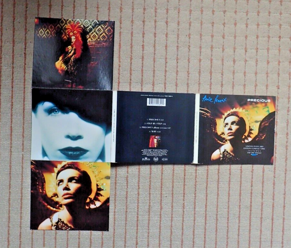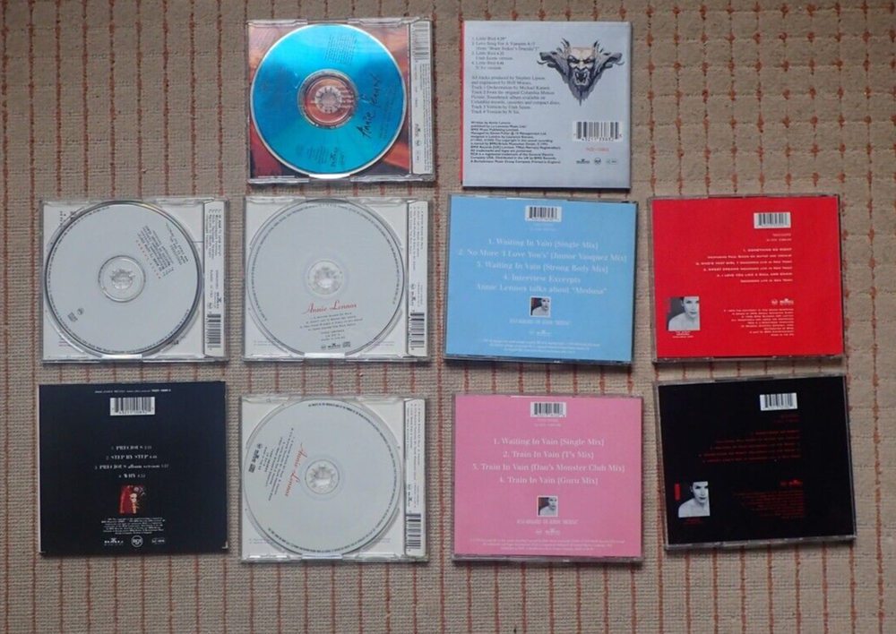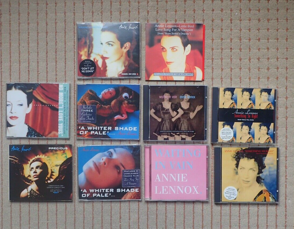 This collection features 10 CD singles by Annie Lennox, a renowned artist in the music industry. Each single is in the CD format, making it easy to play and enjoy. The tracks on these singles are a must-have for any fan of Annie Lennox or music in general. The CD singles are perfect for adding to a collection .With a variety of tracks and genres, there is something for everyone to enjoy. Little Bird / Love Song For A Vampire incl Njoi & Utah Saints mixes Walking On Broken Glass No More I Love You'sWhiter Shade Of Pale cd1Whiter Shade Of pale cd2Precious ... postcard set ltd edition some browning on white card side of postcard (see photo) Waiting In Vain Mixes cdWaiting In Vain cd with interview and exclusive photo setSomething So Right Duet with Paul Simon cd incl live tracks from Radio 1 & New YorkSomething So Right Duet with Paul Simon cd incl live tracks from New York