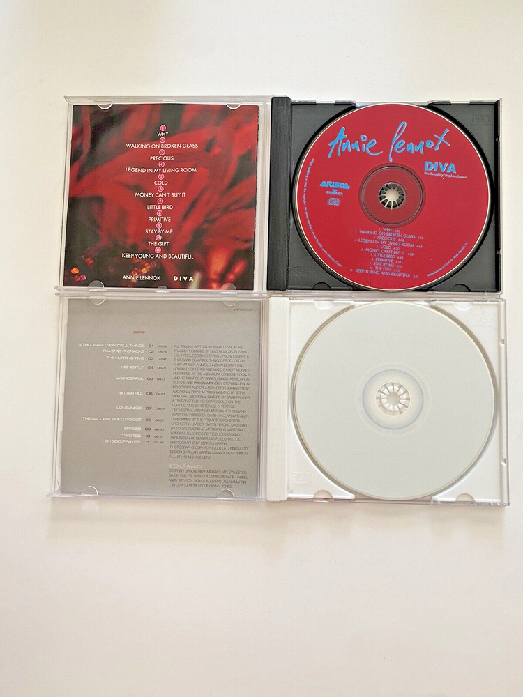 Hi,This is for 2 Annie Lennox CDs, Dive and Bare.Both CDs are in great shape. The Diva case does show some wear on it. The Bare case is in excellent condition.Thanks for checking out my listing!...