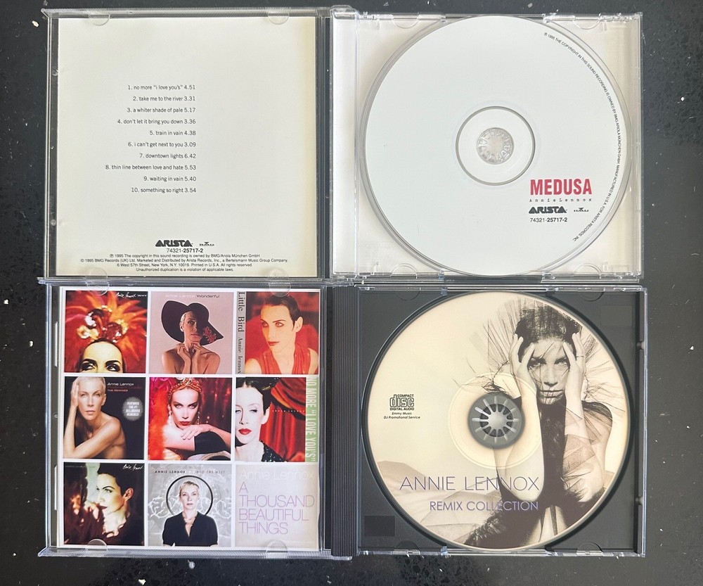 purchasing multiple items from us ? ''ADD TO CART'' and then ' 'request an invoice'' for combined shipping rates. ANNIE LENNOX 2 used CDs 1. MEDUSA (light marks) CD 2. The REMIX Collection CD CDs ONLY sold together Used REMIX CD tracks All 12 tracks are the original 12" & Club mixed compiled and pressed by a DJ service housed in a jewel case w/ full artwork 1. Wh y - SK's Rhythm Mix 7:34 2. No more I love You's - junior vasquez Club Mix 7:35 3. walking on broken glass - David Morales Club Mix 6:15 4. step by step- Original Mix 4:51 5. little bird - Ut ah Saints Club Mix 6:39 6. waiting in vain - Dan's Monster Club Mix 6:20 7. pavement cracks - Goldtrix Full Vocal Mix 6 :35 8. A thousand beautiful things - Gabriel & Dresden Mix 9:08 9. Wonderful - White Label Club Mix 8:54 10. Into the West - Life In Intense Volume Mix 8:34 11. Little Bird - 2003 Club Mix 7:28 MEDUSA : 1. No More I Love You's (#2 in the UK and #23 in the USA) 2. Take Me To The River 3. A Whiter Shade Of Pale (#16 in the UK) 4. Don't Let It Brings You Down 5. Train In Vain 6. I Can't Get Next To you 7. Downtown Lights 8. Thin Line Between Love and Hate 9. Waiting In Vain (#31 in the UK Hot 100) 10. Something So Right (#44 in the UK) ADD TO CART and then ""Request an invoice''' if wanting to purchase multiples items from us. . paypal only pls - shipping in USA 4.85 international SHIPPING- Varies on YOUR Location - average is around 17.00 + but AUS and Japan are always a bit more. we are NOT responsible for ANY customs fees or delays. NO SHIPPING TO CHINA OR RUSSIA Germany/France : Shipping issues in the past w/ your customs: Germany USUALLY takes longer to arrive. 2-4 weeks ++ for first class international if you agree to purchase =we are not responsible for customs fees, or any loss or delays in shipping. enjoy the music! please don't email asking for lower price or extra packaging -- any extra packaging makes the package heavier = more shipping cost. we package secure ly