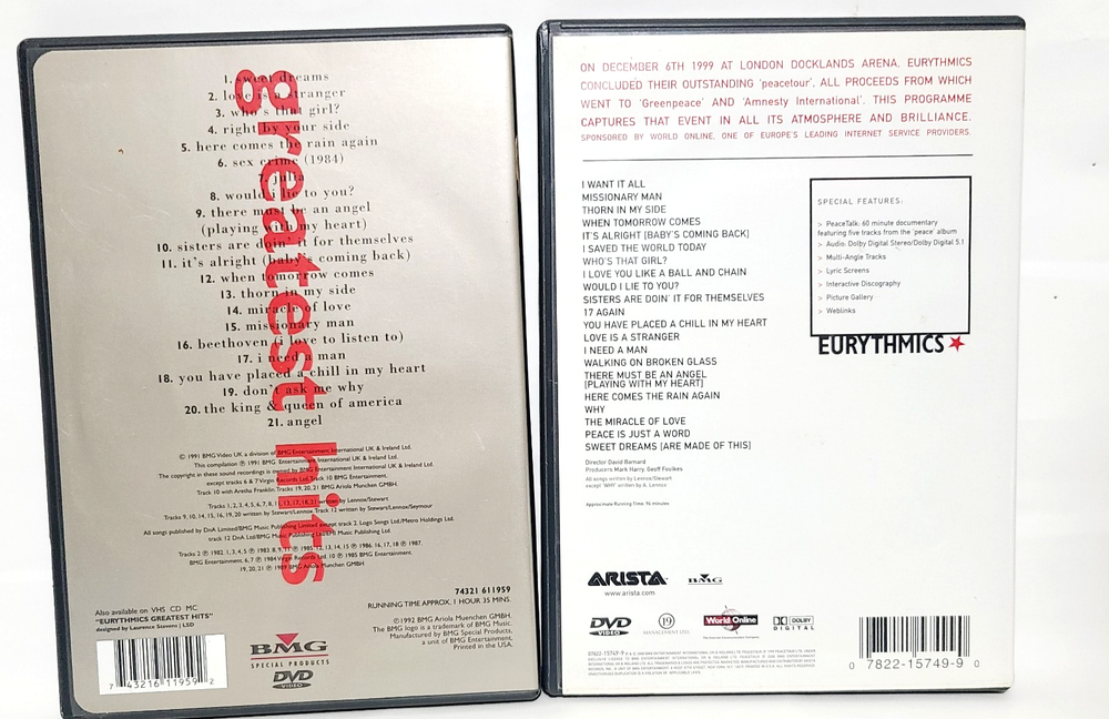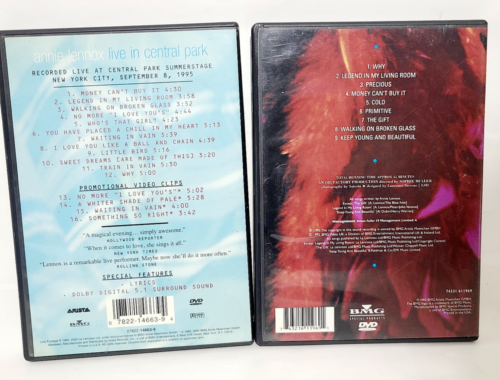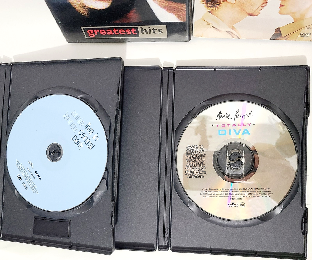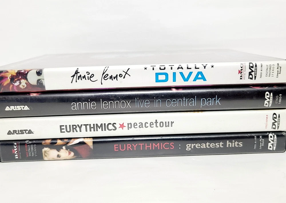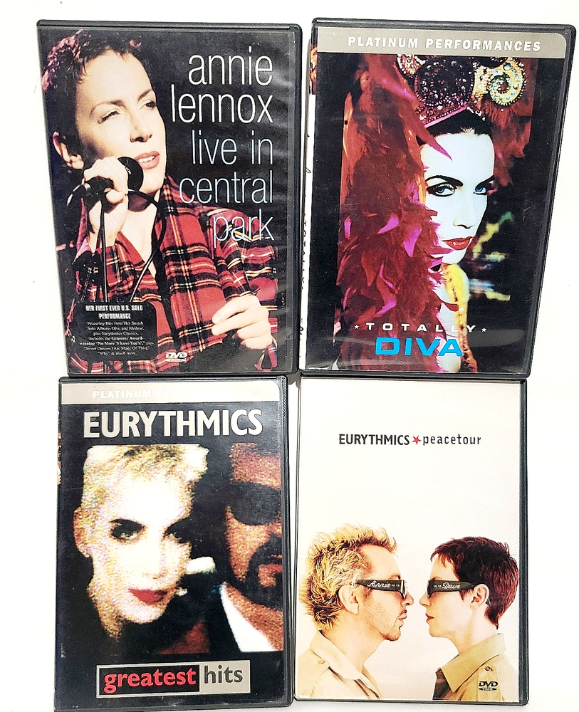 <>WHY SPEND TIME AT FLEA MARKETS / YARD SALES / AUCTIONS? <> LOOK FOR THOSE HARD TO FIND ITEMS HERE!! NEW AND USED ITEMS...PRICED TO SELL! <> THRIFTDUST <> You are bidding on the following item... Annie Lennox 4 DVD Lot Eurythmics greatest hits, Totally Diva, Live in Central Park, Peacetour Please, CHECK ALL PICS BEFORE BIDDING......... YOU WILL RECEIVE THE ACTUAL ITEM PICTURED.