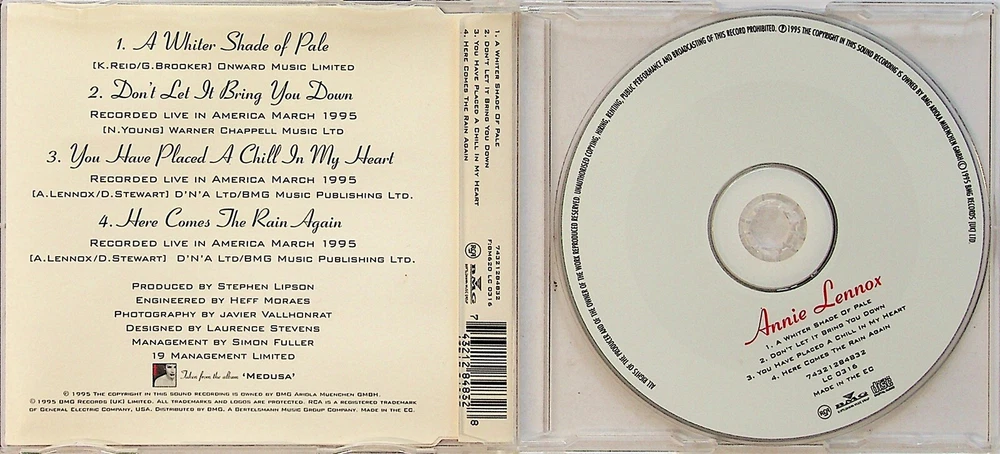 OUR REF - c 67645 Annie Lennox - A Whiter Shade Of Pale +3 Live Tracks CD (1995) The Eurythmics * CONDITION NOTES Disc Condition- Excellent / Complete with Case, Original Insert & Booklet- POSTAGE DISCOUNTS- BUY MORE AND SAVE ON SHIPPING COSTS! THE FIRST ITEM IS FULL PRICE POSTAGE & EACH ADDITIONAL ITEM IS HALF PRICE POSTAGE*. THE 'FIRST' ITEM WILL BE THAT WITH THE HIGHEST POSTAGE COST IN ANY ORDER (*NOTE- SOME VINYL BOX SETS MAY BE EXCLUDED FROM THIS DEAL DEPENDING ON WEIGHT) CUSTOMERS IN THE U.S. - ALL SHIPPING IS NOW TRACKED AS STANDARD BUT BETTER SHIPPING DISCOUNTS ON MULTIPLE ITEM ORDERS ARE AVAILABLE. PLEASE REQUEST AN INVOICE BEFORE CHECKOUT. YOU CAN CONTACT US FOR THE BEST RATES BEFORE MAKING AN ORDER UK CUSTOMERS - IF MAKING A LARGE ORDER PLEASE REQUEST AN INVOICE BEFORE CHECKOUT AS WE MAY BE ABLE TO OFFER BETTER POSTAGE DISCOUNTS PLEASE CONTACT US USING EBAY MESSAGES IF YOU HAVE ANY QUERIES BEFORE OR AFTER YOUR PURCHASE. WE WILL REPLY AS SOON AS POSSIBLE BUT MAY NOT ALWAYS BE ABLE TO RESPOND AT WEEKENDS. WE TAKE GREAT CARE IN OUR LISTINGS BUT IF ANY ITEM FALLS BELOW YOUR EXPECTATIONS THEN PLEASE CONTACT US & WE WILL BE GLAD TO HELP. Powered by SixBit's eCommerce Solution