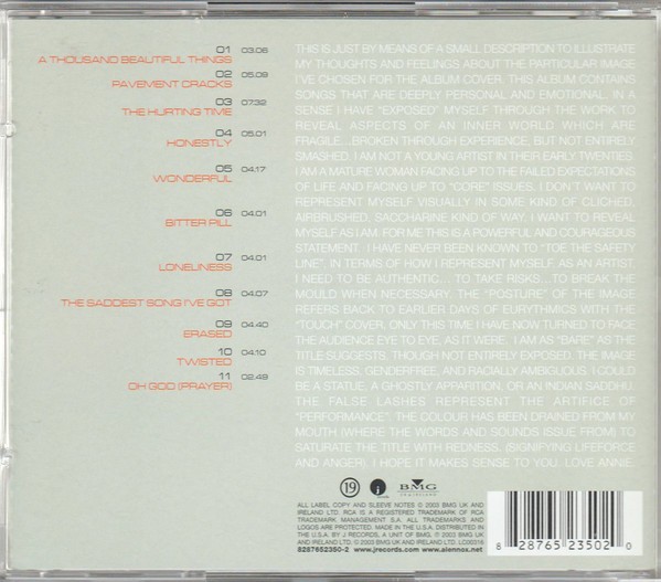 Photos are stock photos for illustrative purposes and are not photographs of the actual item. Product data is prefilled information supplied by a third party service and may vary slightly from the item you receive. Should you require a very specific pressing or edition or have any questions please contact us to verify prior to purchase. We grade very conservatively. The item you will receive will be in AT LEAST the condition described - likely better. We guarantee everything we sell! We combine shipping! You will see combined shipping price to your location when you place items in cart prior to purchase. Please purchase items together in one transaction to receive discounted shipping. Thanks!!! The item you are buying is: Media Condition : Very Good Plus (VG+) Sleeve Condition : Very Good Plus (VG+) Quality used CD in very good condition with case and all original cover art. Notes : Track List : 1. A Thousand Beautiful Things 3:06 2. Pavement Cracks 5:09 3. The Hurting Time 7:32 4. Honestly 5:01 5. Wonderful 4:17 6. Bitter Pill 4:01 7. Loneliness 4:01 8. The Saddest Song I've Got 4:07 9. Erased 4:40 10. Twisted 4:10 11. Oh God (Prayer) 2:49 Barcode and Other Identifiers : Barcode 8 28765 23502 0 Matrix / Runout L388 1187 82876523502 D30523-09 A Mastering SID Code L388 Mould SID Code IFPI 6100 Matrix / Runout L388 1187 82876523502 D30523-05 A Mould SID Code IFPI 6100 Mastering SID Code L388 Copyright (c) BMG UK & Ireland Ltd. Phonographic Copyright (p) BMG UK & Ireland Ltd. Glass Mastered At Cinram, Richmond, IN Glass Mastered At Cinram, Richmond, IN Pressed By Cinram, Richmond, IN