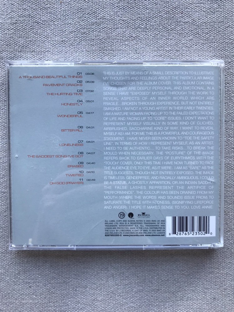 Annie Lennox - Bare (CD) Disc Condition: Excellent/Mint Insert: Like New Jewel Case: Like New Due to cost of shipping, it certainly makes more sense to purchase multiple CDs as opposed to single purchases. The combined shipping cost for up to 4 CDs is $4.99, 5 to 6 CDs is $5.99, and 7 to 9 CDs is $6.99. All purchases are well-packaged and shipped in cardboard containers to ensure the safety of your purchase. As an additional bonus, buy 4 CDs and receive an additional CD of your choice for FREE (The free CD must be of equal value or less to the lowest cost CD purchased and not exceed $9.99 in value).