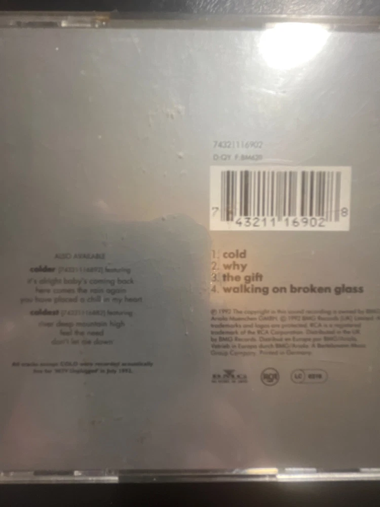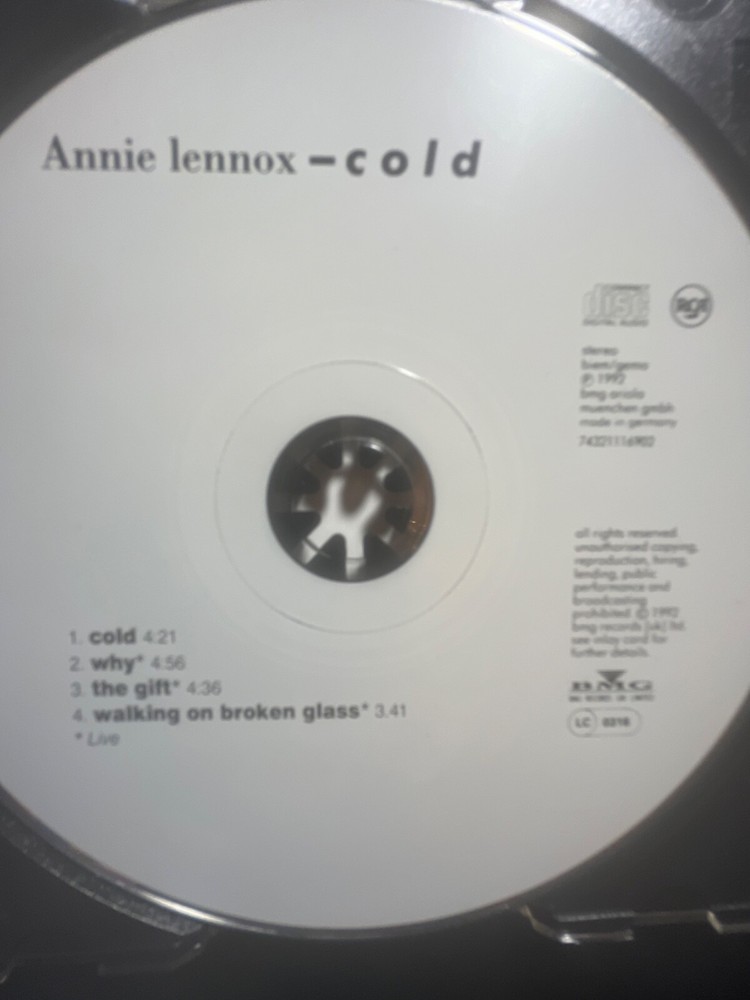 Get your hands on this limited edition Annie Lennox CD, "Cold," featuring the hit songs "Why," "The Gift," "Walking on Broken Glass," and "MTV Unplugged." The CD is in Very GoodbUsed condition ) and comes in a standard jewel case. This maxi-single import was released in 1992 by BMG and is a must-have for any rock or Annie Lennox fan. The CD is in English language and was manufactured in the united kingdom. Please check out my other eBay auctions for more great Eurythmics, and Annie Lennox items that are rare and promotional.
