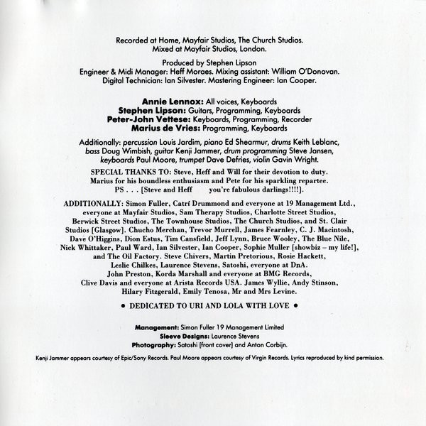 Photos are stock photos for illustrative purposes and are not photographs of the actual item. Product data is prefilled information supplied by a third party service and may vary slightly from the item you receive. Should you require a very specific pressing or edition or have any questions please contact us to verify prior to purchase. We grade very conservatively. The item you will receive will be in AT LEAST the condition described - likely better. We guarantee everything we sell! We combine shipping! You will see combined shipping price to your location when you place items in cart prior to purchase. Please purchase items together in one transaction to receive discounted shipping. Thanks!!! The item you are buying is: Media Condition : Very Good Plus (VG+) Sleeve Condition : Very Good Plus (VG+) Quality used CD in very good condition with case and all original cover art. Holepunch in Barcode Notes : Track 11 listed as a bonus track, available on CD only. Published By La Lennoxa Ltd., BMG Songs, Inc. (ASCAP) Except 4) co-published by Copyright Control; 10) co-published by WB Music Corp., Flag 22 (ASCAP); 11) Warner Bros. Inc. (ASCAP) Printed in U.S.A. [Tray Card] Manufactured in U.S.A. [Disc Face] Track List : 1. Why 4:53 2. Walking On Broken Glass 4:12 3. Precious 5:08 4. Legend In My Living Room 3:45 5. Cold 4:20 6. Money Can't Buy It 4:58 7. Little Bird 4:48 8. Primitive 4:16 9. Stay By Me 6:26 10. The Gift 4:52 11. Keep Young And Beautiful 2:17 Barcode and Other Identifiers : Barcode 07822-18704-2 Barcode 078221870429 Rights Society ASCAP Matrix / Runout 07822187042 DISC MFG, INC. (H) W.O. 25926-7M Matrix / Runout 07822187042 DISC MFG, INC. (H) W.O. 25926-1 Matrix / Runout 07822187042 DISC MFG, INC. (H) W. O. 25926-3 Matrix / Runout 07822187042 DISC MFG, INC. (H) W.O. 25926-2M Matrix / Runout 07822187042 DISC MFG, INC. (H) W.O. 25926-1M Record Company Bertelsmann Music Group Phonographic Copyright (p) BMG Ariola München GmbH Copyright (c) BMG Records (UK) Ltd. Marketed By Arista Records, Inc. Distributed By Arista Records, Inc. Manufactured For Arista Records, Inc. Recorded At Mayfair Studios Recorded At The Church, London Mixed At Mayfair Studios Published By La Lennoxa Ltd. Published By BMG Songs, Inc. Published By Copyright Control Published By Wb Music Corp. Published By Flag 22 Published By Warner Bros. Inc. Pressed By Disc Manufacturing, Inc., Huntsville