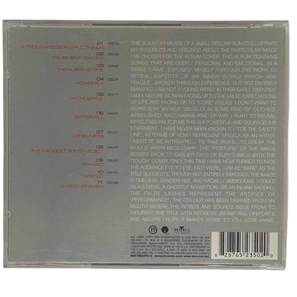 🎶 Annie Lennox – Bare (CD) – A Raw and Soulful Masterpiece Experience the emotional depth and powerful voice of one of music’s most iconic artists with Annie Lennox – Bare . This 2003 solo album is a stripped-down, soul-baring journey that showcases Lennox’s vocal brilliance and lyrical honesty like never before. From heartache to healing, Bare is a stunning, introspective work that resonates on every level. 🎤 Album Overview: In Bare , Annie Lennox trades the upbeat rhythms of her Eurythmics days for something more intimate and reflective. This critically acclaimed album blends pop, soul, and soft rock with poetic lyrics and haunting melodies, creating an emotional listening experience from start to finish. Standout tracks like “Pavement Cracks,” “Wonderful,” and “A Thousand Beautiful Things” offer raw vulnerability, layered with lush instrumentation and Lennox’s unmistakable voice. If you're drawn to music with depth, soul, and meaning, Bare is an album that belongs in your collection. 💿 CD Details: Artist: Annie Lennox Album Title: Bare Format: CD Genre: Pop, Soul, Adult Contemporary Release Year: 2003 Label: J Records Tracklist Includes: A Thousand Beautiful Things Pavement Cracks The Hurting Time Honestly Wonderful Bitter Pill Loneliness The Saddest Song I've Got Erased Twisted Oh God (Prayer) Condition: Very Good Packaging: Standard jewel case 🌟 Why You’ll Love It: ✅ Annie Lennox’s Most Personal Album – A deeply emotional and reflective work ✅ Critically Acclaimed – Praised for its honesty, depth, and vocal excellence ✅ Soulful & Mature Sound – Perfect for fans of meaningful, adult contemporary music ✅ Timeless Themes – Loneliness, self-reflection, healing, and hope ✅ A Must-Have for Annie Lennox Fans 🔑 SEO Keywords: Annie Lennox Bare CD , Annie Lennox solo album , Bare album CD , emotional pop album , adult contemporary CD , Annie Lennox music , soulful female vocalists , J Records Annie Lennox , Pavement Cracks CD , A Thousand Beautiful Things 📦 Condition: Very Good 📬 Ships fast and securely 🎁 A thoughtful gift for fans of introspective, soulful music 🎧 Bare is Annie Lennox at her most vulnerable, most powerful, and most human. Add this emotional and inspiring album to your collection today and let the music move you. The disc has no scratches and the jewel case will be replaced with a brand new heavy duty case - Free Shipping Our goal is to make every pre owned CD that goes out to look as new as possible. Why Buy Your CDs from The Rustic Den? At The Rustic Den , we believe in quality over quantity . Every used CD we sell is in like-new condition , because we take the time to ensure you’re getting the best. We replace all jewel cases with heavy-duty 90g cases , not the flimsy, cheap ones you’ll find elsewhere. Our discs are carefully inspected, cleaned, and preserved —because your collection deserves more than scratched, second-rate CDs. We’re not the cheapest, and we don’t aim to be. Instead, we focus on delivering the highest-quality used CDs so you can build a collection that lasts . We’re passionate about keeping physical media alive and helping a new generation appreciate the value of owning music. When you shop with us, you're not just buying a CD— you're investing in quality, nostalgia, and the freedom to own your music forever. 🎶