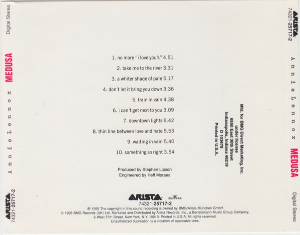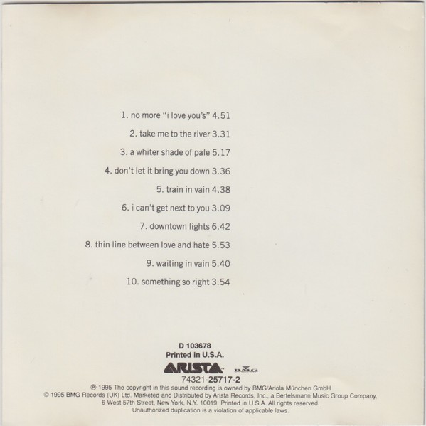 Photos are stock photos for illustrative purposes and are not photographs of the actual item. Product data is prefilled information supplied by a third party service and may vary slightly from the item you receive. Should you require a very specific pressing or edition or have any questions please contact us to verify prior to purchase. We grade very conservatively. The item you will receive will be in AT LEAST the condition described - likely better. We guarantee everything we sell! We combine shipping! You will see combined shipping price to your location when you place items in cart prior to purchase. Please purchase items together in one transaction to receive discounted shipping. Thanks!!! The item you are buying is: Media Condition : Very Good Plus (VG+) Sleeve Condition : Very Good Plus (VG+) Quality used CD in very good condition with case and all original cover art. Notes : [Rear cover]: ℗ 1995 The copyright in this sound recording is owned by BMG/Ariola München GmbH © 1995 BMG Records (UK) Ltd. Marketed and Distributed by Arista Records, Inc., a Bertelsmann Music Group Company. Printed in U.S.A Mfd. for BMG Direct Marketing, Inc. under license D 103678 [Disc face]: D103678 MFD. for BMG Direct Market under license ℗ 1995 The copyright in this sound recording is owned by BMG/Ariola München GmbH. Manufactured in U.S.A for Arista Records, Inc. [Booklet]: D 103678 Printed Durations <Track 5> 4:38 <Track 8> 5:53 Similar to [l=Allied DT] repress [r=2399098], but without Barcode on rear cover art Track List : 1. No More "I Love You's" 4:51 2. Take Me To The River 3:31 3. A Whiter Shade Of Pale 5:17 4. Don't Let It Bring You Down 3:36 5. Train In Vain 4:44 6. I Can't Get Next To You 3:09 7. Downtown Lights 6:42 8. Thin Line Between Love And Hate 4:55 9. Waiting In Vain 5:40 10. Something So Right 3:54 Barcode and Other Identifiers : Matrix / Runout 1919-1-1 HMG *7432125717-2* Mastering SID Code IFPI L451 Mould SID Code IFPI 7708 Mould SID Code ifpi 7706 Manufactured For BMG Direct Marketing, Inc. Licensed To BMG Direct Marketing, Inc. Manufactured For BMG Direct Market Licensed To BMG Direct Market Phonographic Copyright (p) BMG Ariola München GmbH Copyright (c) BMG Records (UK) Ltd. Marketed By Arista Records, Inc. Distributed By Arista Records, Inc. Record Company Bertelsmann Music Group Manufactured For Arista Records, Inc. Pressed By HMG (2)