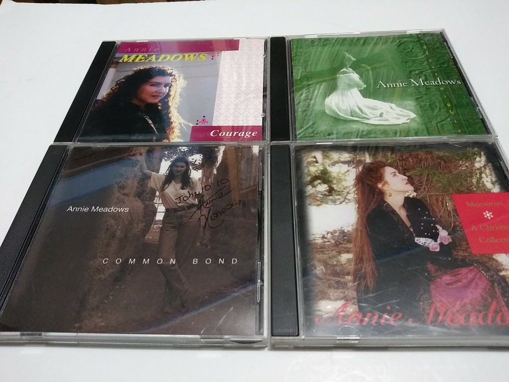 This is a lot of 4 CD's by Annie Meadows 1)Common Bond- CD is VG with several light scuffs 2)Memories: a Christmas Collection CD is in Excellent condition with minor wear 3)Courage CD is is in Excellent condition 4)Endless Nights CD is VG with some light scuffs ** Common Bond inlay is Signed by Annie Meadows