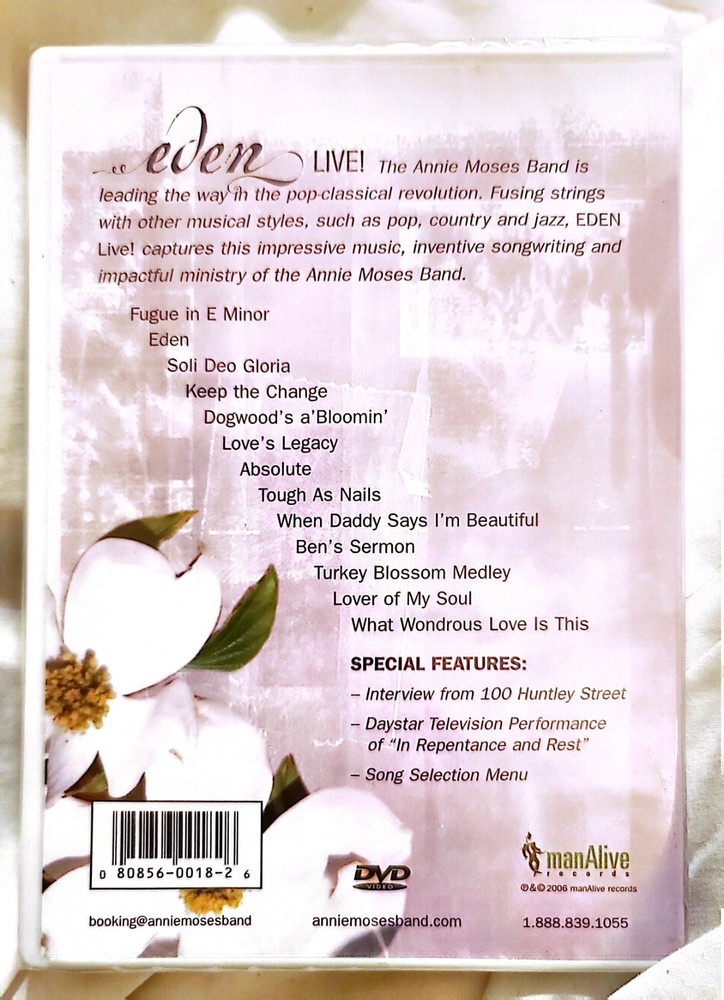Brand New and SEALED! **Get combined shipping on DVDs! Add multiple DVDs to your cart and it will automatically calculate your discount based on weight!** ==== ### Eden Live! **The Annie Moses Band** The Annie Moses Band is leading the way in the pop-classical revolution. Fusing strings with other musical styles such as pop, country, and jazz, *EDEN Live!* captures the impressive music, inventive songwriting, and impactful ministry of the Annie Moses Band. **Tracklist:** 1. Fugue in E Minor 2. Eden 3. Soli Deo Gloria 4. Keep the Change 5. Dogwood's a'Bloomin' 6. Love's Legacy 7. Absolute 8. Tough As Nails 9. When Daddy Says I'm Beautiful 10. Ben's Sermon 11. Turkey Blossom Medley 12. Lover of My Soul 13. What Wondrous Love Is This --- ### Special Features: - Interview from *100 Huntley Street* - Daystar Television Performance of "In Repentance and Rest" - Song Selection Menu --- ### Additional Information: **ManAlive Records** ℗&©2006 ManAlive Records **UPC:** 0 80856-0018-2 6 **Format:** DVD