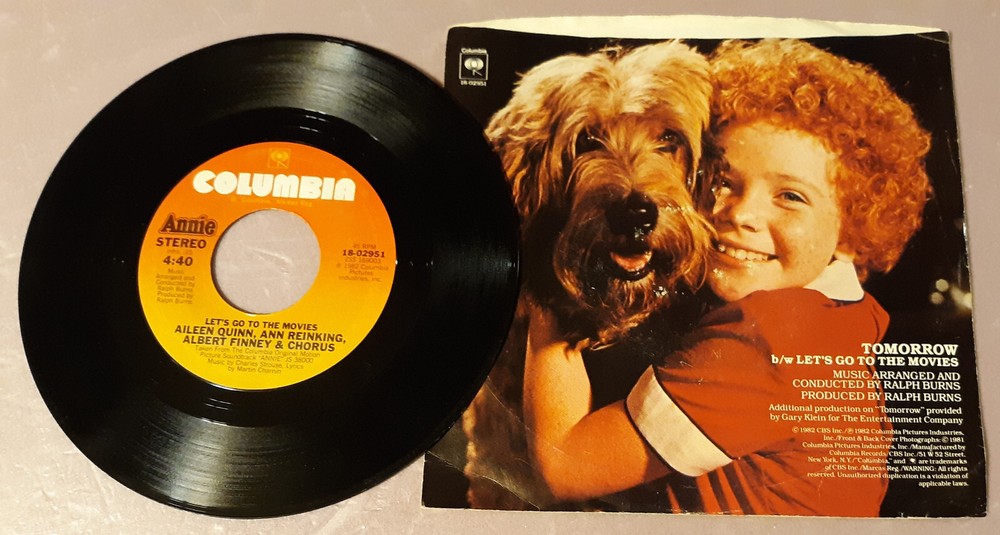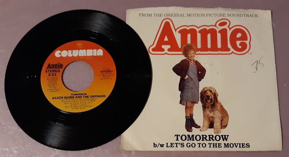 Annie Motion Picture - Aileen Quinn & Others Tomorrow/Let's Go To The Movies by Columbia Records 45rpm 7" Vinyl A3 See my other listings for more vintage records & combine shipping. To combine shipping for "buy it now" items use the "Add To Cart' button. When you are done, VIEW your cart and then select "Request Total" Vinyl records are graded visually and listed in ebay's item specifics. There are not enough hours in the day to play test the hundreds of records that are listed and will be listed. Mint (M) Appears unplayed and will bear no marks, sleeve scuffs, or scratches. Near Mint (NM) Vinyl is near perfect. At most, a light scuff appears on the record. Excellent (EX) May have one or two visible imperfections (i.e. sleeve scuffs, faint scratches, or other superficial marks) that will not affect play. Very Good Plus VG+ A few visible imperfections. These may include sleeve scuffs, light scratches, or other superficial marks. Very Good (VG) Same imperfections found on VG+ records but in slightly greater numbers. Records graded VG and above will typically not have any scratches that are deep enough to be felt with a fingernail. Good (G+) A number of visible imperfections; the presence of a considerable number of light scratches will force a G+ grade, as will the presence of significant isolated defects such as scratches deep enough to be felt with a fingernail. Good (G) Pervasive imperfections of varying degrees including both light scratches and scratches deep enough to be felt with a fingernail. Fair/Poor (F) Records described as fair are ones that are basically unlistenable. Surface noise, skips and pops make hearing what's on the record nearly impossible, if not completely impossible. The only reason to keep it would be if the record is extremely rare or you want to eventually melt the vinyl and shape it into an ashtray or hang it on the wall.