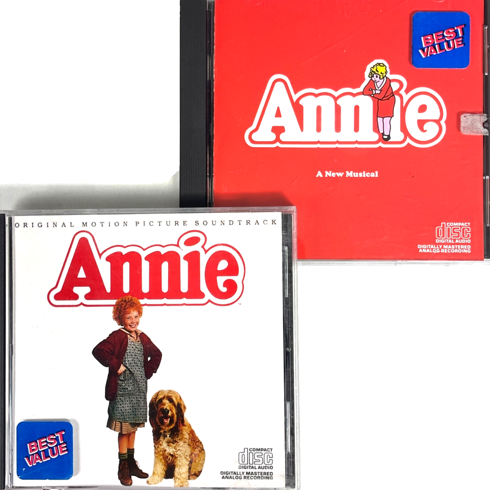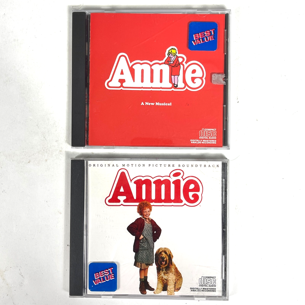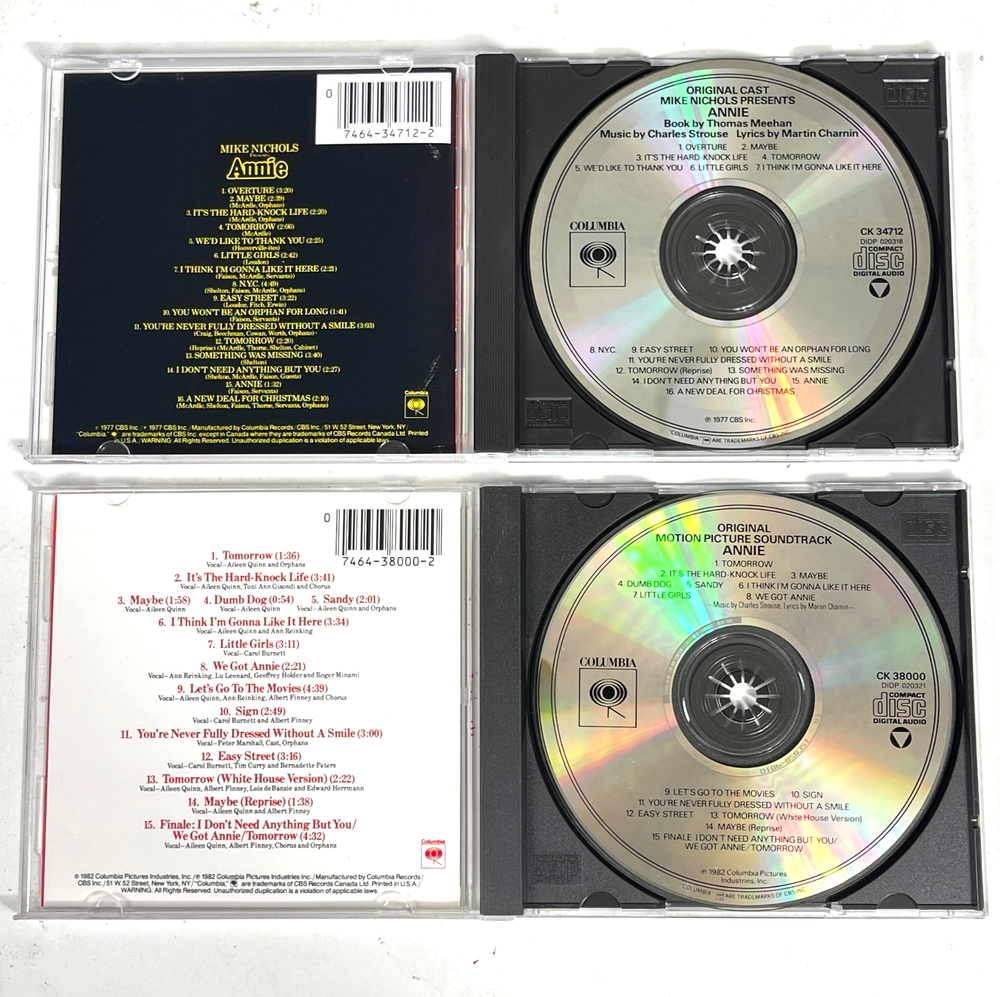 ANNIE -Two (2) CD Bundle Original Cast presented by Mike Nichols/ 1977 Original Motion Picture Soundtrack/ 1982 See pics for all tracks & details CDs play PERFECT, without skips, come in jewel cases w/ inserts as shown / Visual condition of CDs' playing surfaces range: Near-Mint to VG, light scuffing / Condition of CD packaging: minor cosmetic wear to cases -no notches, punches, stamps or markings /