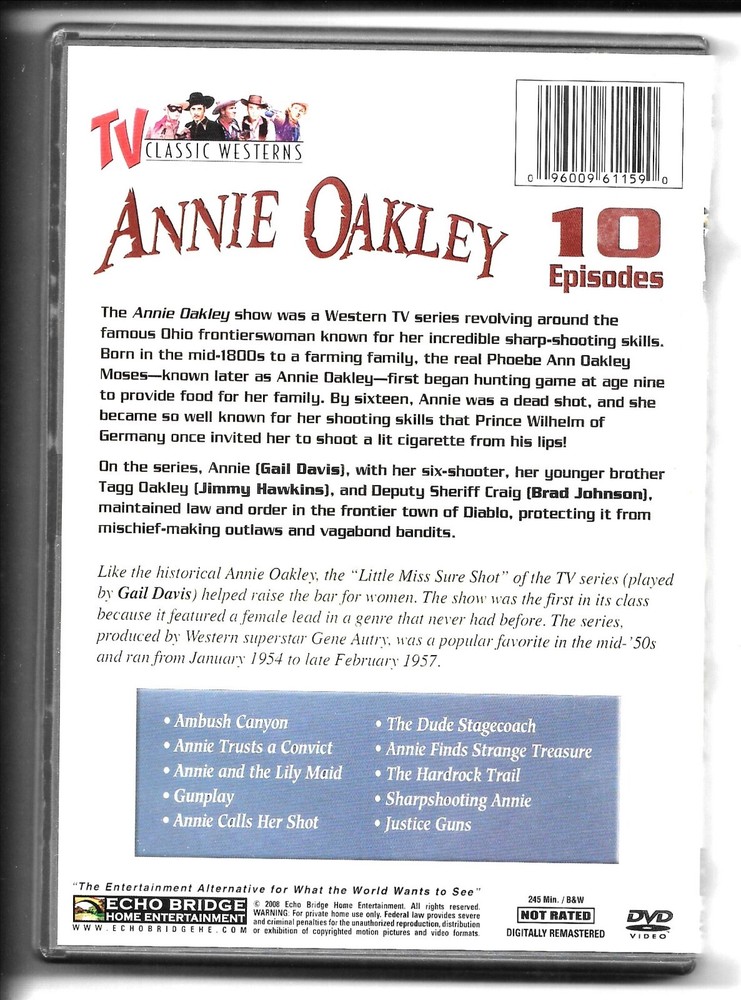 Annie Oakley is a 10-episode DVD set that brings the classic Western series to your home. Starring Gail Davis as the title character, Brad Johnson as Hawkeye, and Jimmy Hawkins as Little Jake, this collection offers a nostalgic journey through the rugged world of the frontier. Each episode is presented in black and white, allowing you to experience the show as it was originally televised. This DVD features a total run time of 245 minutes and is enclosed in a tall DVD case, ensuring that it stands out in your collection. The DVD is in English and has an NR (Not Rated) classification, making it suitable for all ages. Echo Bridge Home Entertainment has packaged this Western genre gem, offering fans and newcomers a slice of television history.