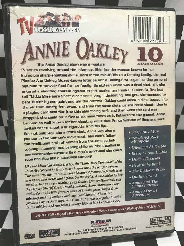 ITEM: · Used DVD “Annie Oakley – 2 Disc / 10 Episodes / TV Classic Westerns” About this product Product Identifiers UPC 096009228897 eBay Product ID (ePID) Product Key Features Format DVD Director Genre TV Shows Additional Product Features Number of Discs 2 Leading Role Gail Davis CONDITION: · Used, includes case. · DVDs: “Scratches-Light” DVD tested – no issues. · T he case “may have” some wear and tear and other issues from storage (see pix). · Sold "as is", so please look closely at the pictures. SHIPPING: · USPS Media $4.80, 1st Class $8.00, or Priority in USA only $11.00. Sorry no international shipping · Due to the increase in gas prices and the rising costs of supplies, etc.. within our economy, we have had to change our business hours and days to 3 days a week. Ships Mondays thru Wednesdays. There may be delays due to weather or other issues such as pandemic. So please rest assured your item will ship as soon as possible. RETURNS : · Sorry, we do not accept returns. THIS MEAN NO RETURNS!!! So please make sure to READ the entire description information and make sure you want to purchase BEFORE you buy. Sorry to have to state the obvious, but there are lots of people out there that just like to cause trouble and it’s not fair to sellers trying to make an honest living. · Please make sure you read the entire description before bidding and ask all questions before purchasing and paying for items. · Under SOME special circumstances, we will cancel orders when requested, provided they have not been paid for and are done within 30 minutes of the purchase. Once the item has been paid for, it will be processed for shipping. · ALL SALES ARE FINAL “ONCE YOU HAVE PAID FOR THEM”. PAYMENT: · Buyer to pay via Paypal or eBay immediately upon auction end. ADDITIONAL NOTES: · PLEASE!! Provide positive feedback after our transactions. We’ve sold over a thousand DVD’s and other items and have received less than 20% feedback on our transactions. eBay sellers live and die based on feedback. So please help us. Thank you. · See our other auction items and combine shipping. If Ebay doesn’t automatically combine the shipping, let us know and we will work with you to either refund you the difference or provide a discount. Item #434