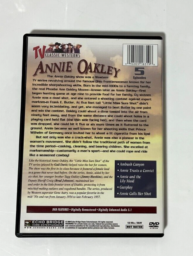 Up for Sale is "Annie Oakley" 5 Episodes on DVD Episodes included are: "Ambush Canyon" "Annie Trusts a Convict" "Annie and the Lily Maid" "Gunplay" "Annie Calls Her Shot" DVD is Pre-Owned but in Very Good Condition See Photos! Comes from a smoke free/pet free home