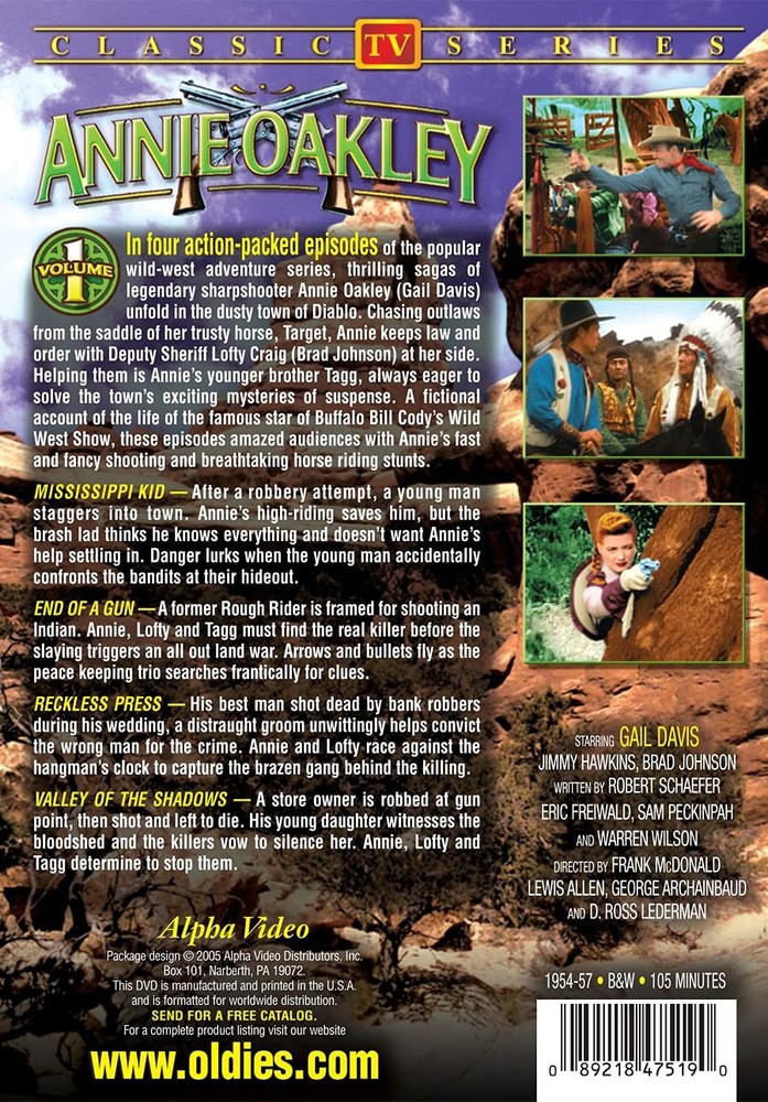 Further Details Title: Annie Oakley - Volume 1 Format: DVD Condition: New Number Of Discs: 1 Release Date: 05/31/2005 Actors: Gail Davis, Brad Johnson, Jimmy Hawkins Director: Frank McDonald, George Archainbaud, Lewis Allen, Sam Peckinpah Audio Language: English Runtime: 105 Region Code: DVD: 1 (US, Canada...) Studio: Alpha Video Certificate: MPAA Not Rated Description: In four action-packed episodes of the popular wild-west adventure series, thrilling sagas of legendary sharpshooter Annie Oakley (Gail Davis) unfold in the dusty town of Diablo. Chasing outlaws from the saddle of her trusty horse, Target, Annie keeps law and order with Deputy Sheriff Lofty Craig (Brad Johnson) at her side. Helping them is Annie's younger brother Tagg, always eager to solve the town's exciting mysteries of suspense. A fictional account of the life of the famous star of Buffalo Bill Cody's Wild West Show, these episodes amazed audiences with Annie's fast and fancy shooting and breathtaking horse riding stunts. Mississippi Kid: After a robbery attempt, a young man staggers into town. Annie's high-riding saves him, but the brash lad thinks he knows everything and doesn't want Annie's help settling in. Danger lurks when the young man accidentally confronts the bandits at their hideout. End of a gun: A former Rough Rider is framed for shooting an Indian. Annie, Lofty and Tagg must find the real killer before the slaying triggers an all out land war. Arrows and bullets fly as the peace keeping trio searches frantically for clues. Reckless Press: His best man shot dead by bank robbers during his wedding, a distraught groom unwittingly helps convict the wrong man for the crime. Annie and Lofty race against the hangman's clock to capture the brazen gang behind the killing. Valley of the Shadows: A store owner is robbed at gun point, then shot and left to die. His young daughter witnesses the bloodshed and the killers vow to silence her. Annie, Lofty and Tagg are determined to stop them. Aspect Ratio: Audio Format: Color / Black & White: Black & White Special Features: DVDs ARE REGION 1 UNLESS OTHERWISE STATED Missing Information? Please contact us if any details are missing and where possible we will add the information to our listing.