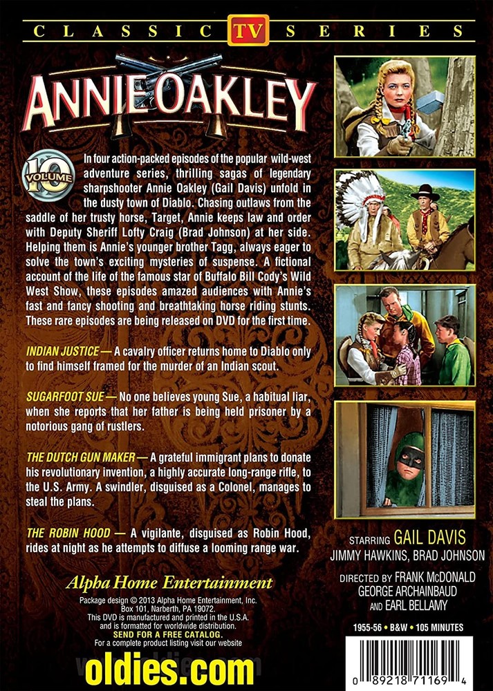 Further Details Title: Annie Oakley, Volume 10 Format: DVD Condition: New Number Of Discs: 1 Release Date: 07/30/2013 Actors: Gail Davis, Jimmy Hawkins, Brad Johnson, Frank McDonald, George Archainbaud Director: Frank McDonald, George Archainbaud, Earl Bellamy Audio Language: English Runtime: 1 hour and 45 minutes Region Code: DVD: 1 (US, Canada...) Studio: Alpha Video Description: Four remastered lost episodes of the beloved cowboy adventure show. DVDs ARE REGION 1 UNLESS OTHERWISE STATED Missing Information? Please contact us if any details are missing and where possible we will add the information to our listing.