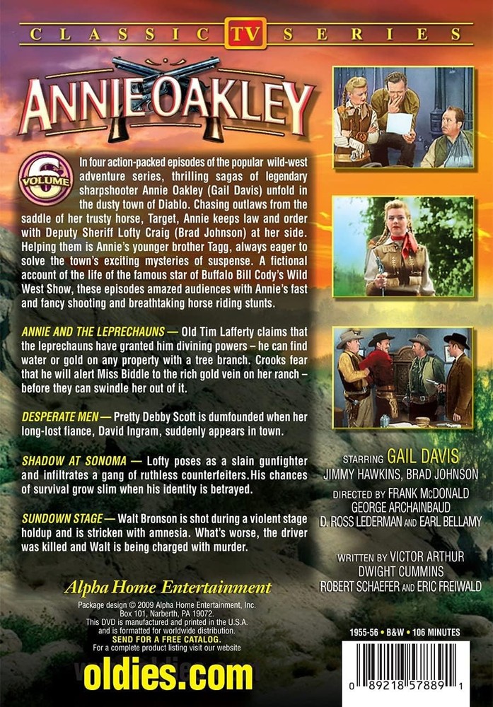Further Details Title: Annie Oakley, Volume 6 Format: DVD Condition: New Number Of Discs: 1 Release Date: 03/31/2009 Actors: Gail Davis, Jimmy Hawkins, Brad Johnson Audio Language: English Runtime: 1 hour and 30 minutes Region Code: DVD: 1 (US, Canada...) Studio: Alpha Video Certificate: MPAA Not Rated Description: Four episodes from the classic western TV series. DVDs ARE REGION 1 UNLESS OTHERWISE STATED Missing Information? Please contact us if any details are missing and where possible we will add the information to our listing.