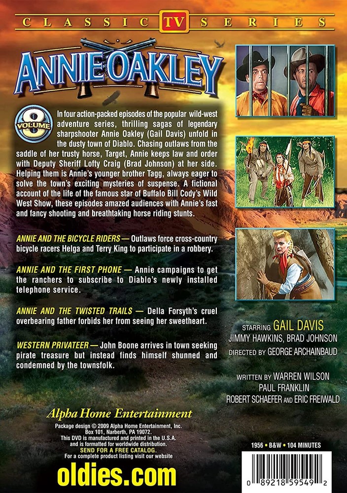 Further Details Title: Annie Oakley, Volume 8 Format: DVD Condition: New Number Of Discs: 1 Release Date: 12/29/2009 Actors: Gail Davis Audio Language: English Runtime: 1 hour and 46 minutes Region Code: DVD: 1 (US, Canada...) Studio: Alpha Video Certificate: MPAA Not Rated Description: Four (more) episodes from the classic western TV series. DVDs ARE REGION 1 UNLESS OTHERWISE STATED Missing Information? Please contact us if any details are missing and where possible we will add the information to our listing.