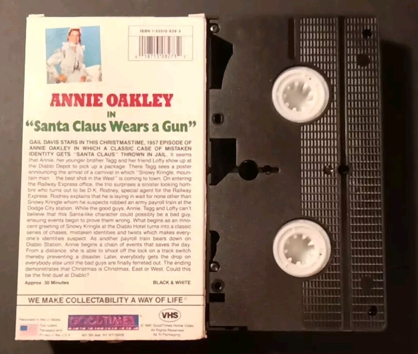 Annie Oakley in "Santa Claus Wears a Gun" brings the spirit of the West to the holiday season in this unique VHS release from Goodtimes Home Video. A classic Western with a festive twist, this film captures the charm and wit of the legendary sharpshooter, played by actress Anne Oakley, as she teams up with a fellow cowboy to ensure a gunslinger doesn't ruin Christmas. The 1957 movie, reissued in 1991, is presented in English and adheres to the NTSC signal standard. Whether you're a Western genre enthusiast or a collector of holiday-themed films, this VHS tape offers a quaint and entertaining viewing experience, complete with the timeless antics of Annie Oakley and her trusty sidekick. Please look at photos for they are part of the description; if something isn't in the photo it isn't included with your purchase. If you have any questions; please don’t hesitate to ask. Most of our items are free shipping within the United States and we offer International shipping via eBay’s Global shipping program. Please inquiry with eBay regarding cost and availability. PAYMENTS: We accept eBay payments. SHIPPING: We ship all items within your payment clearing. We do not ship items on Holidays and Weekends. We believe in recycling; sometimes you will receive some interesting boxes. We are tree huggers. We bubble wrap all our fragile items. All our items come from a smoke free environment. We are a pet friendly home. RETURNS: We accept returns within 30 days of the original purchase date for a full refund. All items MUST come back in the original condition they were shipped out and arrive in. Buyer pays for return shipping. FEEDBACK: We aim to earn positive 5- star feedback for every item. We will never willing deceive you in any of our listings. We try to point out an flaws with the merchandise so you will not encounter any surprises. If you are happy with your purchase please take a moment to leave positive 5-star feedback. If you should have any issues with your purchase please contact us directly using eBay’s messaging service to resolve the issue so we can earn your positive 5- star feedback. WYE