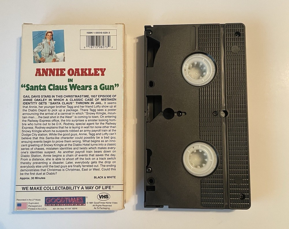 Experience the holiday spirit of the Old West with the "Annie Oakley in Santa Claus Wears a Gun" VHS. This classic 1957 film, released by GoodTimes Home Video in 1991, brings together the legendary shooter and the timeless tale of Christmas in a way that only Oakley's charm and skill could deliver. Perfect for collectors and Western enthusiasts, the VHS is presented in NTSC format with English language for your enjoyment. Whether you're revisiting this holiday favorite or discovering it for the first time, Annie Oakley's adventures await, blending action and yuletide cheer in a genre-defining performance.