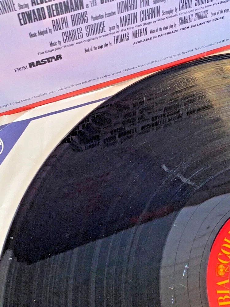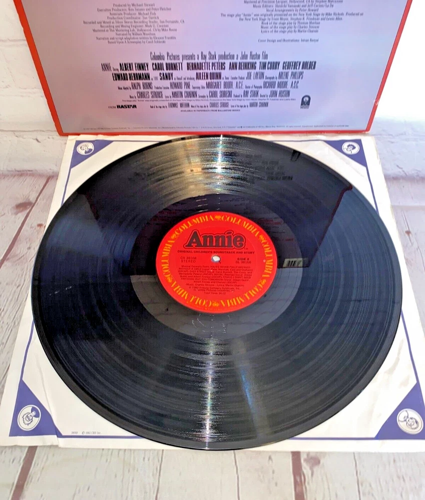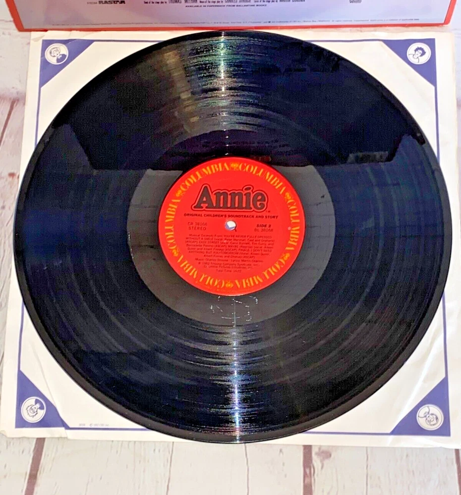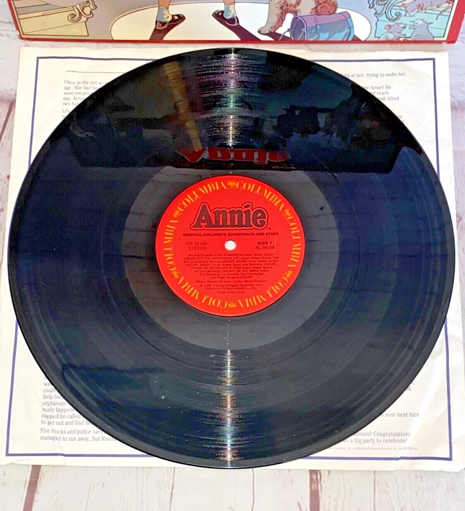 Used Annie Original Children's Soundtrack and Story vinyl record 12" 33rpm Columbia 1982 | The record has light wear and works. The album cover has wear, light marks on the inside, and tear.