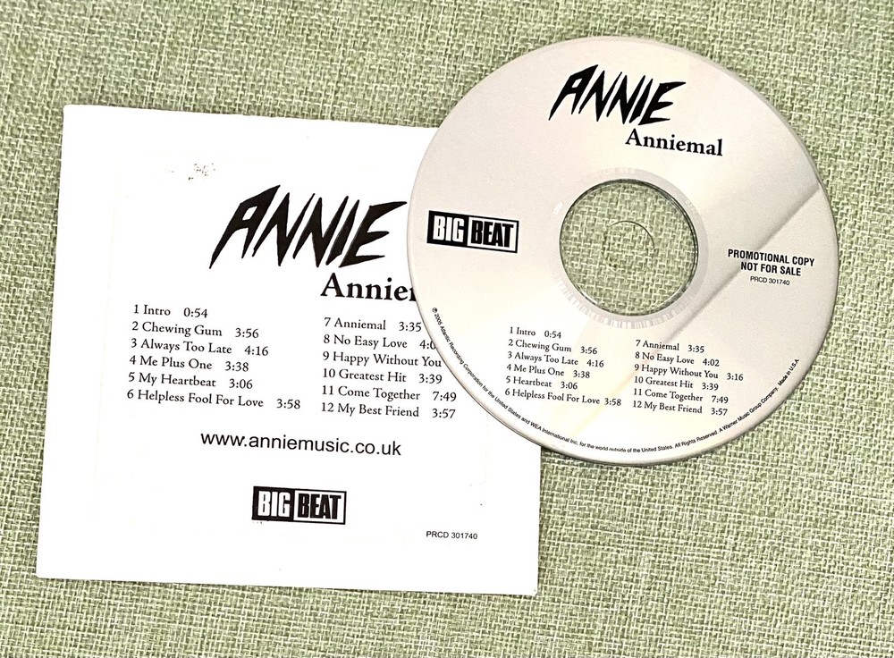Hello! Rare Promo CD from Annie Anniemal Cardsleeve Promo CD PRCD 301740 1. Intro (0:54) 2. Chewing Gum (3:56) 3. Always Too Late (4:16) 4. Me Plus One (3:38) 5. My Heartbeat (3:06) 6. Helpless Fool For Love (3:58) 7. Anniemal (3:35) 8. No Easy Love (4:02) 9. Happy Without You (3:16) 10. Greatest Hit (3:39) 11. Come Together (7:49) 12. My Best Friend (3:57) I will gladly combine shipping Check Out my other auctions Hundreds of rare Promo CD's This is in good condition and great for the collector Thank You!