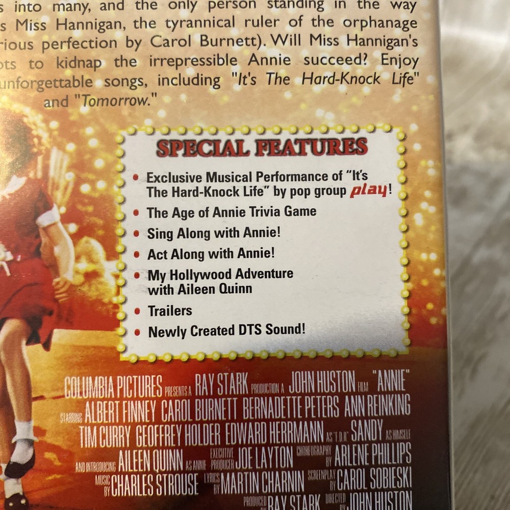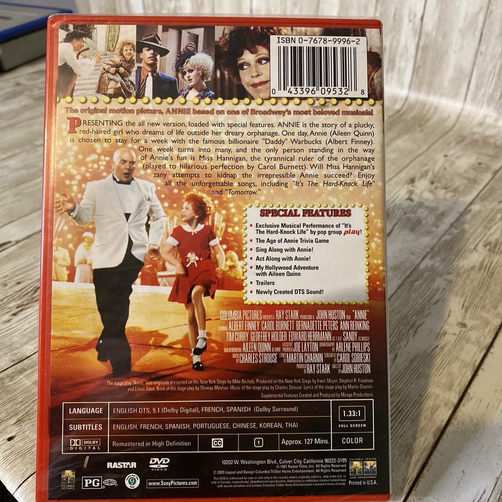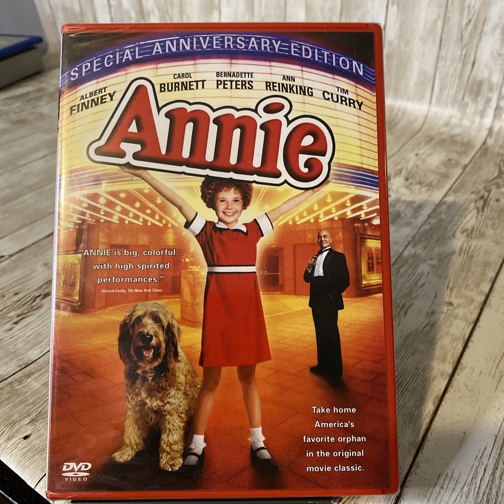 Celebrate the special anniversary of the beloved musical "Annie" with this new, factory-sealed DVD edition. This heartwarming classic stars Albert Finney, Tim Curry, and Carol Burnett in a tale of a young girl's journey to find her family and a place to call home. The DVD features full screen format and a run time of 127 minutes. It also includes English, French, and Spanish language options, as well as subtitles in those languages. This special edition DVD is rated PG and is perfect for family viewing. Don't miss out on the chance to bring home this timeless musical favorite for your collection. This DVD is New Factory Sealed. 032224FHP#16F