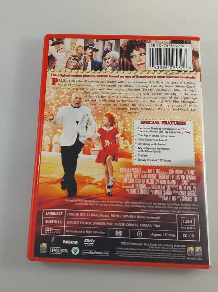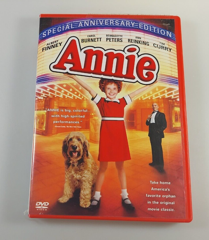 This special anniversary edition of the iconic movie, Annie, is a must-have for any collector or fan of classic movies. The DVD format ensures that you can enjoy the timeless story and catchy songs in high quality. The edition also includes special features that provide a deeper insight into the making of the movie and its cultural impact. See pics for condition. Please look at ALL PICTURES included in the listing Many questions about the condition of the item can be answered by looking at the pictures. If you have questions or are unsure of something about the item, please send us a message. We will respond as promptly as we can (usually the same day) Our return policy is 30 DAYS for any reason, with you, the buyer paying for the shipping. Thanks!