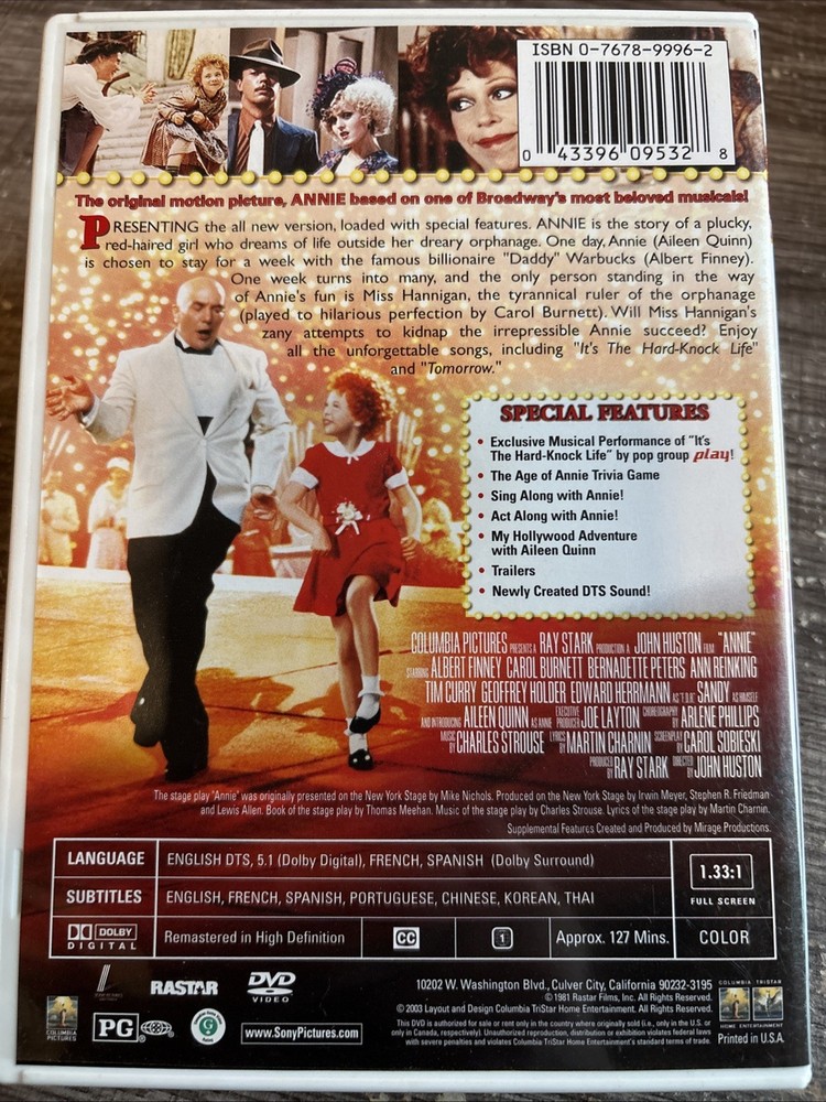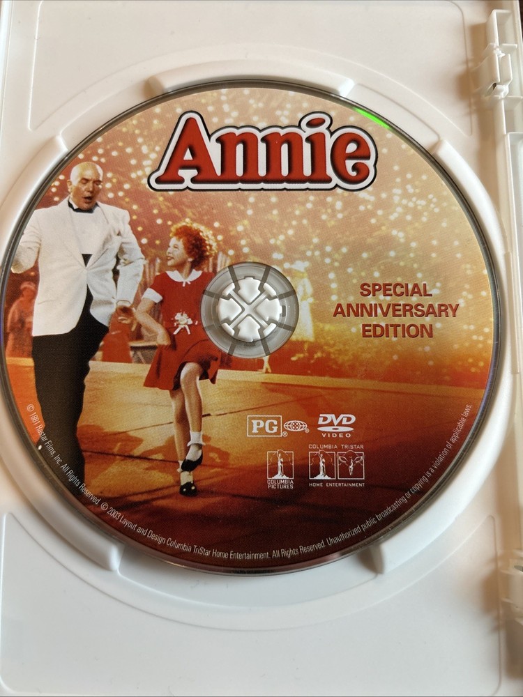 B2. Buy more, save more with combine shipping. Purchase which ever you choose and I’ll send you an invoice. It’s that easy, as always ships same day! Minus Sunday but packaged and shipped first thing Monday morning! The product is a special anniversary edition DVD of the movie "Annie." This edition includes additional content or features to commemorate the film's milestone anniversary. The DVD format allows for easy viewing and enjoyment of the classic musical film in the comfort of your own home. Perfect for fans of the movie or collectors looking to add a special edition to their DVD collection.
