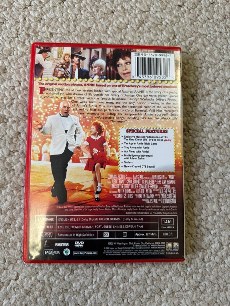 This DVD is a must-have for all movie lovers. It features the beloved story of Annie, presented in a special anniversary edition format. The DVD is perfect for those who enjoy family-friendly movies, with a G rating that ensures its suitability for all ages. The format of the DVD is DVD, making it easy to play on any device that supports it. The movie/TV title is Annie (Special Anniversary Edition), and it comes in a special edition edition. This DVD is a great addition to any collection, and it is sure to provide hours of entertainment for the whole family. Tested and In very good condition. DVD case may show some wear Will combine shipping