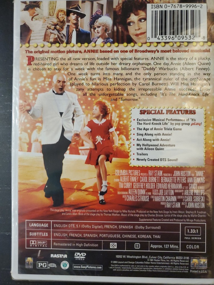 Celebrate the timeless classic with this special anniversary edition DVD of Annie. This DVD is perfect for fans of musicals and family-friendly movies. The disc contains the beloved film in its original format, making it a must-have for any movie collection. Featuring the lovable orphan Annie and her adventures with Daddy Warbucks, this special edition DVD also includes bonus features and exclusive content. Whether you're introducing the film to a new generation or reliving your childhood memories, this Annie DVD is sure to bring joy and entertainment to all. Location56 1