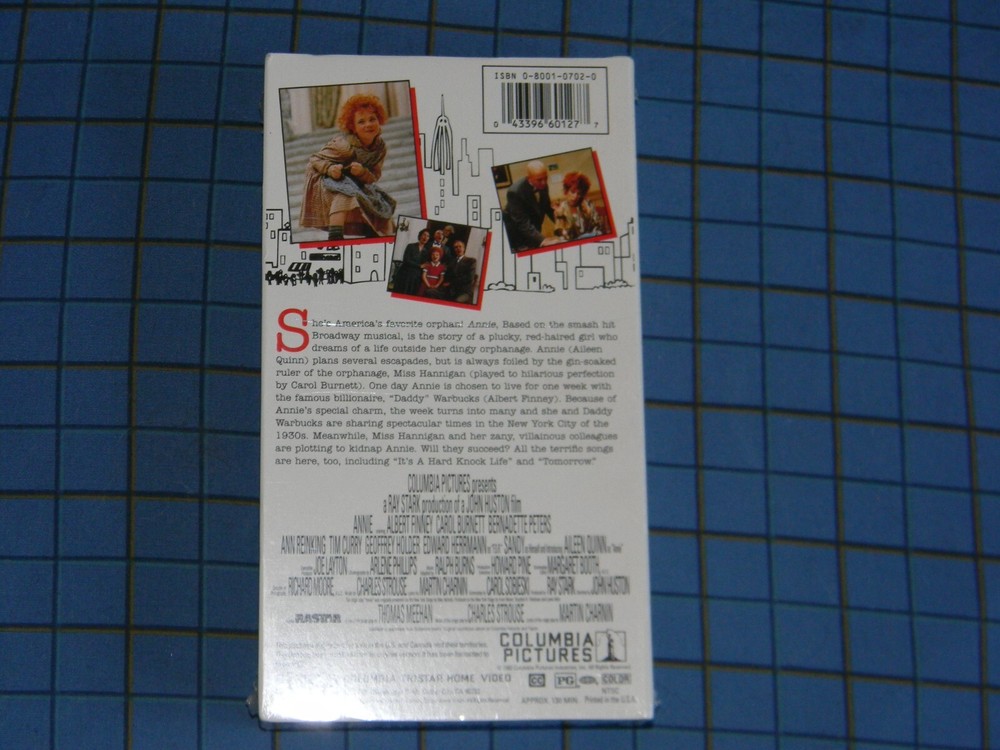 Get ready to sing and dance along to the beloved classic musical, "Annie"! This VHS tape from Columbia Pictures features an all-star cast, including Albert Finney, Aileen Quinn, and Carol Burnett. The movie follows the heartwarming story of a young orphan girl who dreams of finding a loving family, set against the backdrop of 1930s New York City. With a G rating and NTSC signal standard, this movie is perfect for all ages and English-speaking audiences. This edition comes in a cardboard sleeve and is New. Don't miss out on the chance to own this timeless piece of cinema history! See photos for condition Feel free to send offers