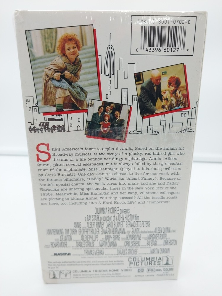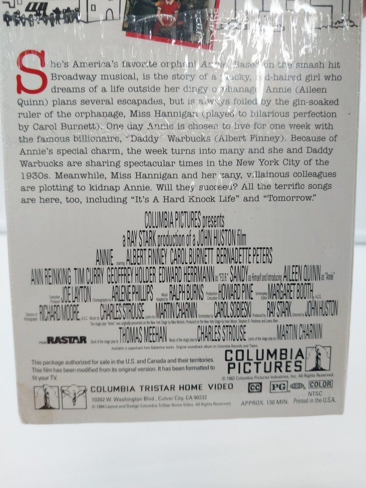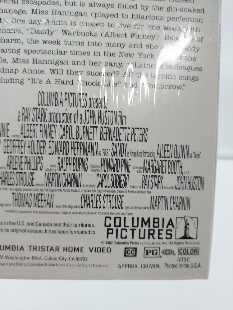 This Annie VHS tape is a classic feature film from Columbia Pictures, featuring the talented Tim Curry and Carol Burnett. The movie is a must-see for English language speakers who are fans of the 1982 film. The tape is still sealed and in great condition, ready to be added to your collection. Get your hands on this piece of cinematic history today! Please see pics of item as part of description