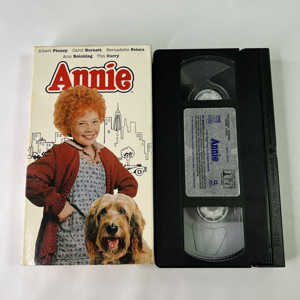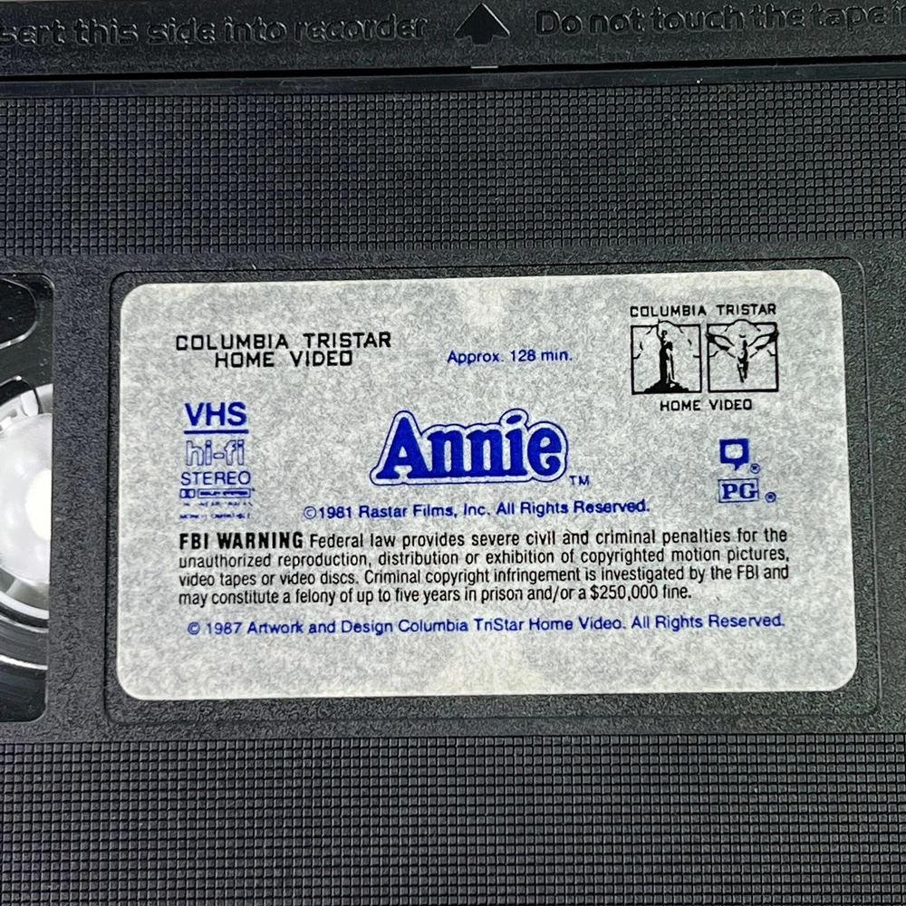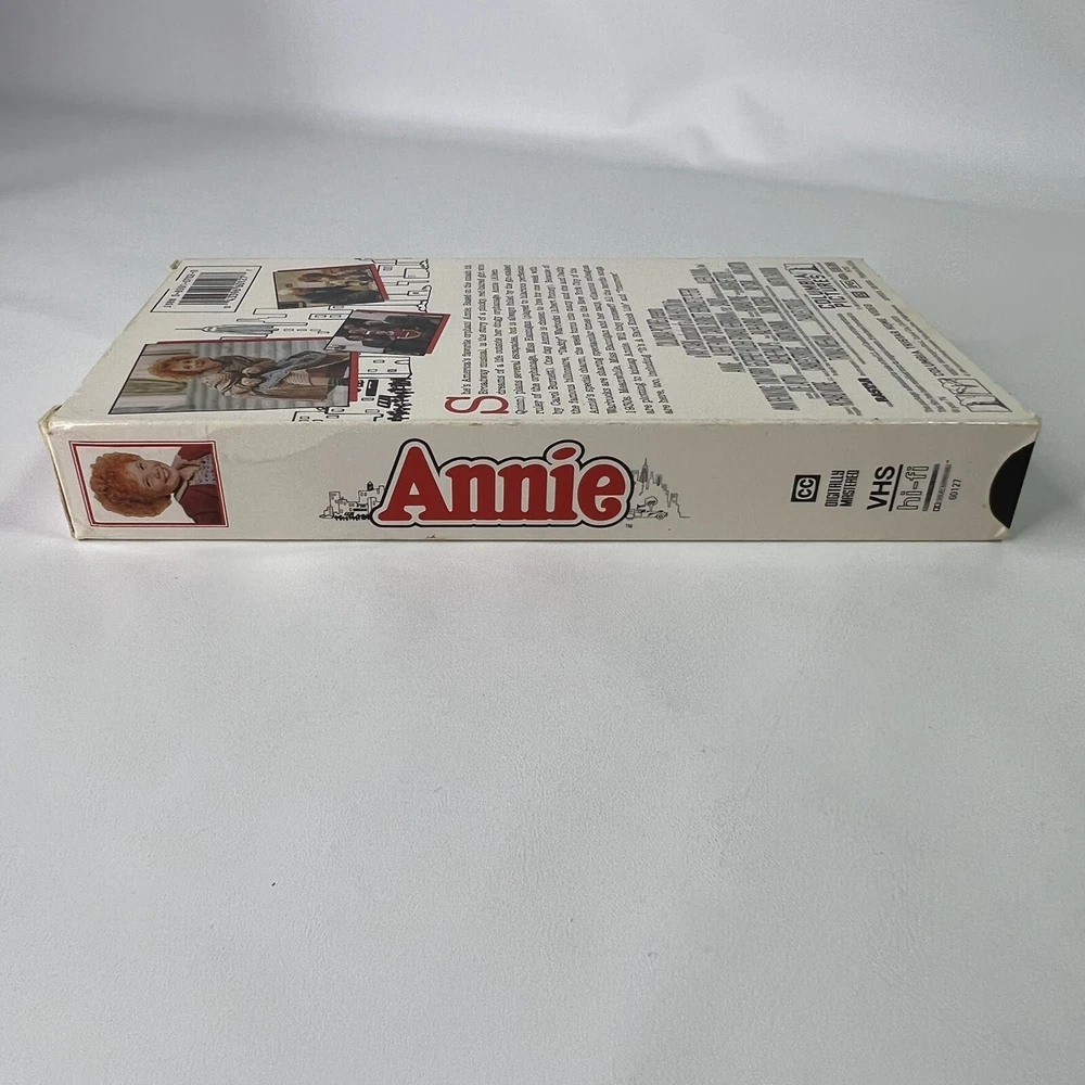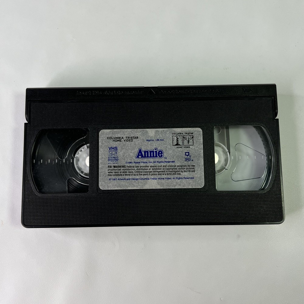 Annie VHS Cassette Tape Tested and works. Box has some wear. Good, pre-owned condtion. The glue from the sticker on the cassette tape has bled through leaving an oily look on the sticker. (see pic)