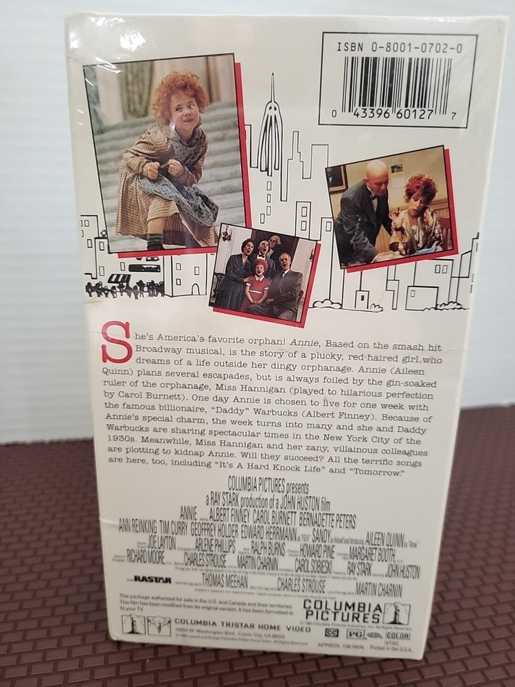 Experience the classic musical tale of Annie, directed by John Huston, on VHS. This beloved film stars Aileen Quinn and Carol Burnett, and features a talented cast and crew. The VHS format ensures optimal viewing quality for this G-rated musical, which is perfect for fans of Broadway and musicals in general. This VHS tape is a must-have for any collector or fan of Annie. The signal standard is NTSC and the sub-genre is musicals. Whether you're reliving your childhood memories or discovering this film for the first time, Annie is sure to delight and entertain.