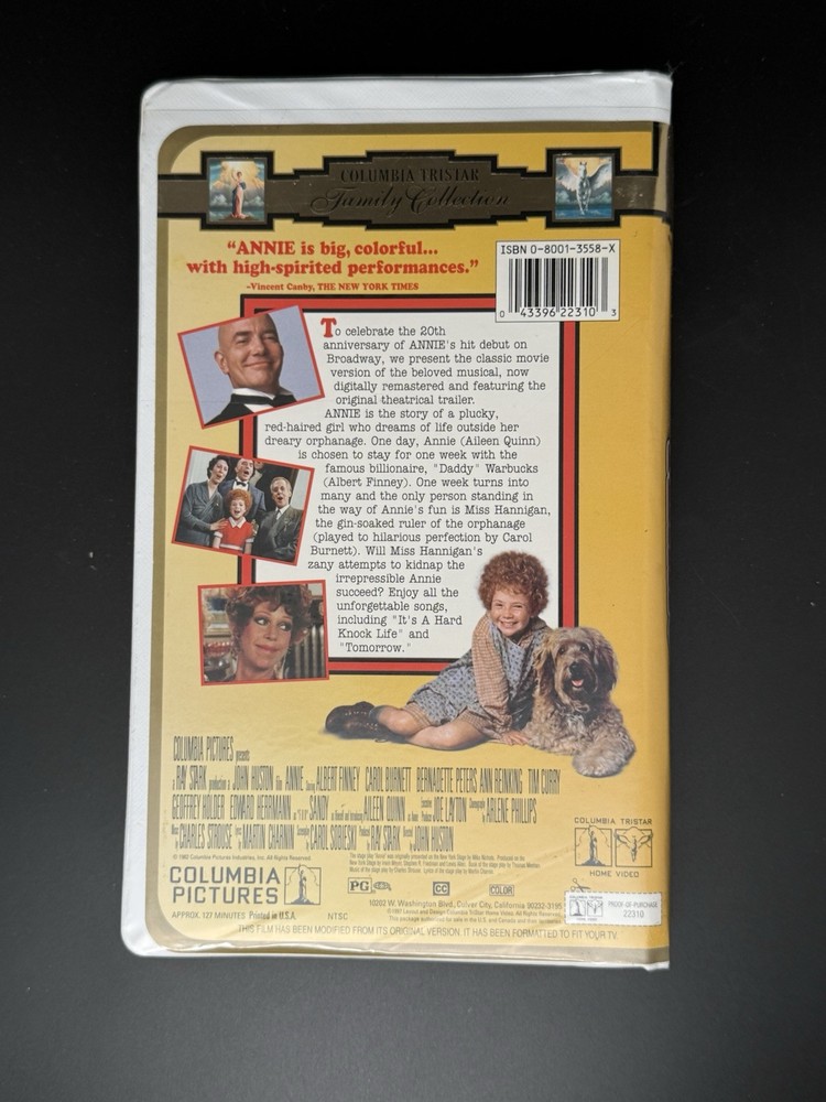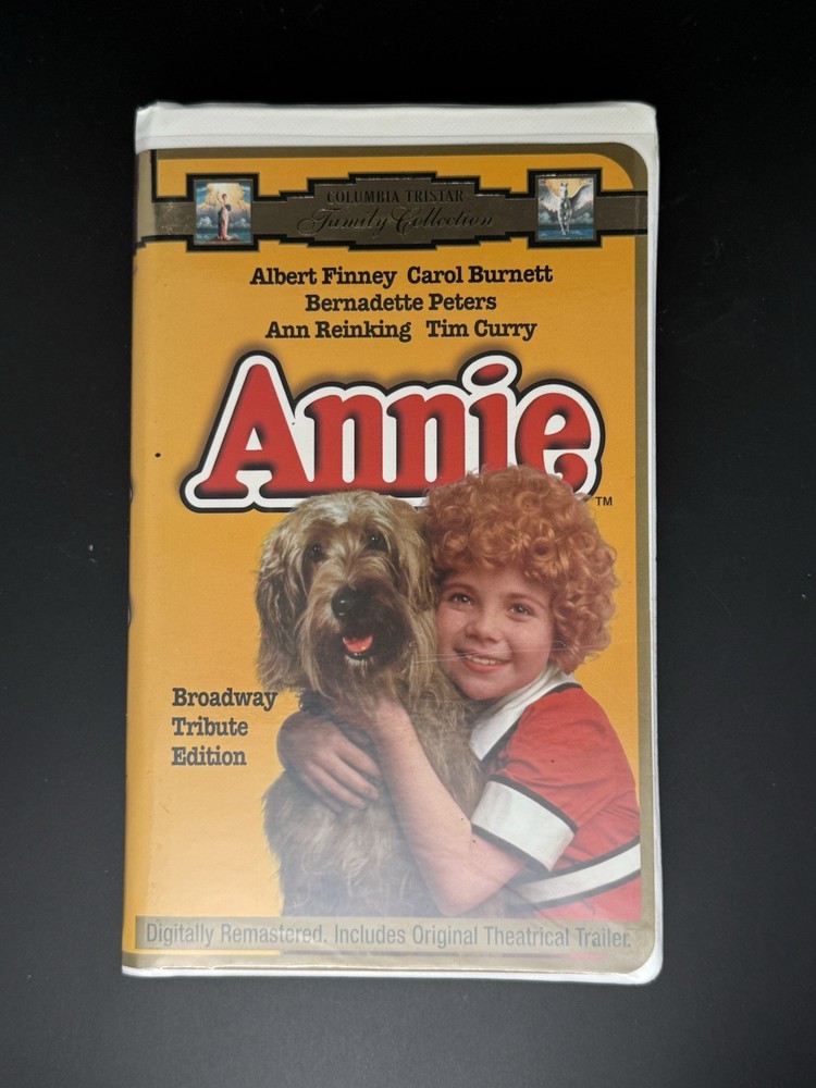 The product is the "Annie VHS 1999 Broadway Tribute Edition Family Collection" featuring the actor Carol Burnett in the leading role. It is a musical movie in NTSC signal standard with a G rating. The VHS tape is from Columbia Pictures and includes the movies "Annie" and "Oliver!" in a Side-To-Side clam shell Duracase. It is part of the Musical & Performing Arts genre.
