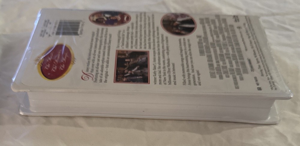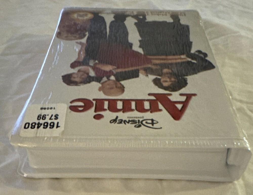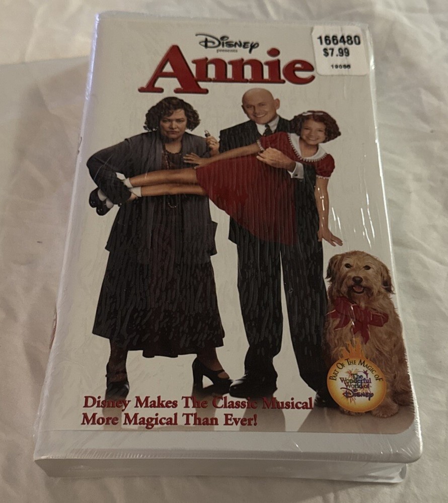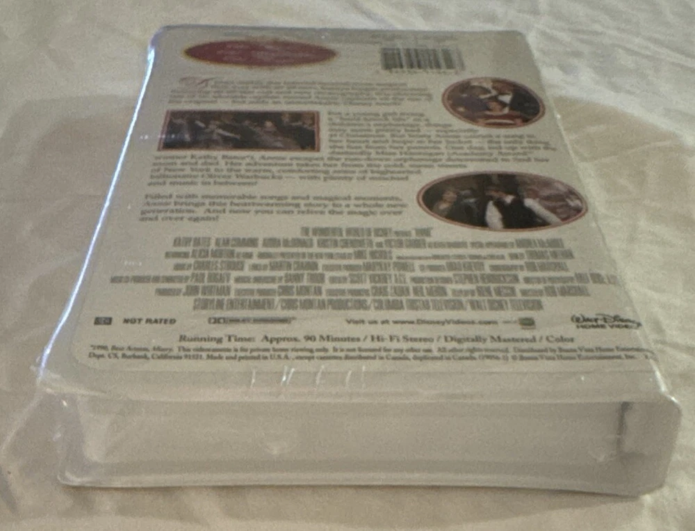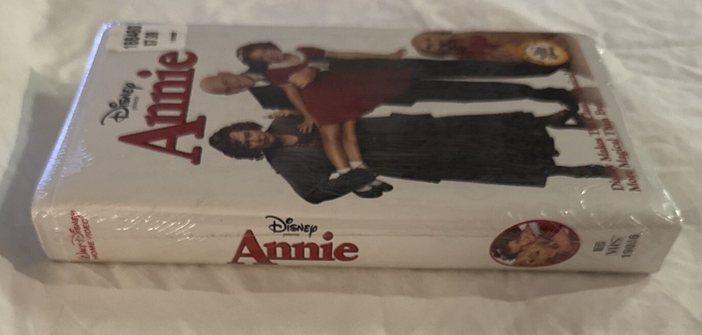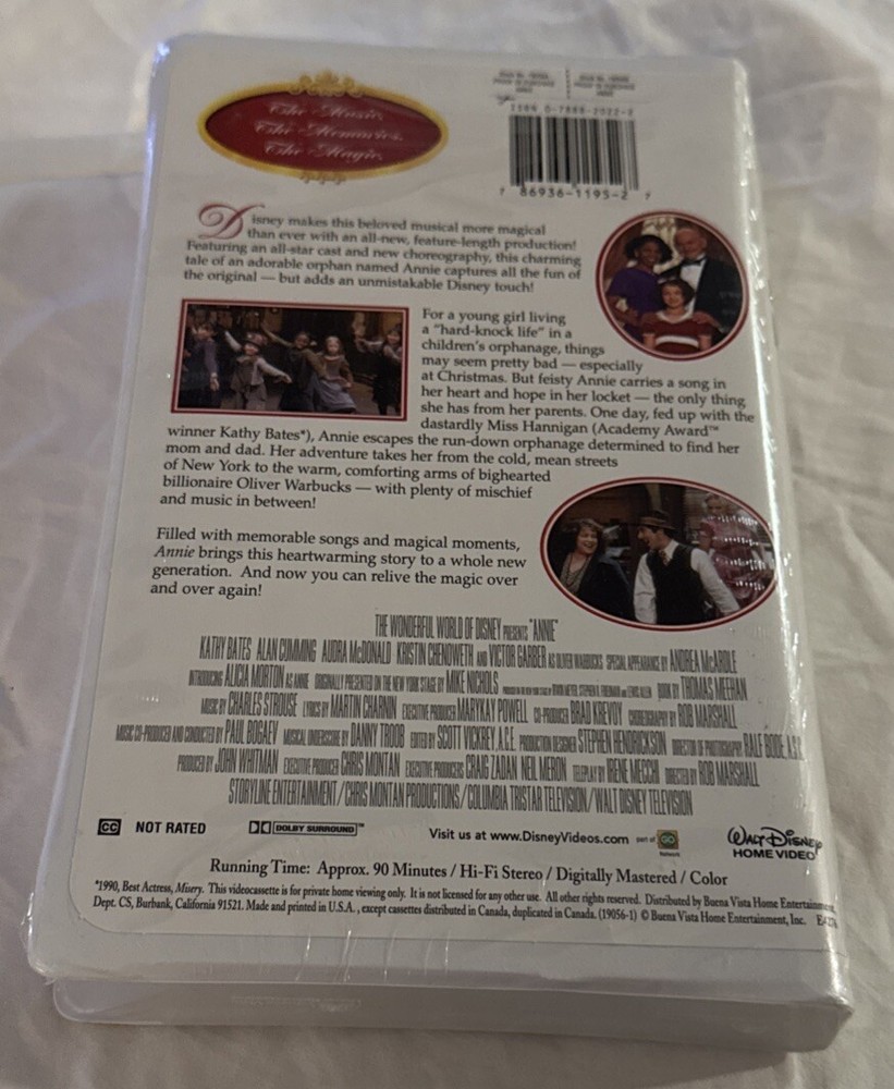 The product is a VHS tape of the 1999 film "Annie," directed by Rob Marshall and produced by Disney. Starring Victor Garber, Alicia Morton, Alan Cumming, and Kathy Bates, the live-action musical is a children's and family movie based on the classic story of Annie. This sealed clamshell edition does not indicate it was a former rental, and it follows the NTSC signal standard in English language. It features Kathy Bates in a leading role alongside Sarah Hyland. Small hole in corner of seal See pics for condition