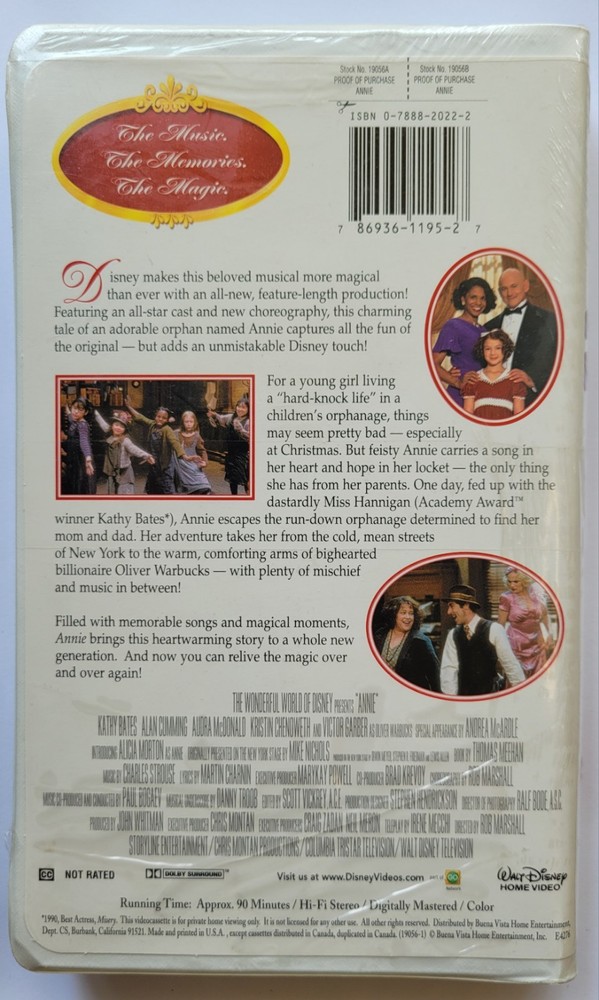 This classic musical adventure is ready to bring joy to a new generation. "Annie" on VHS, released in 2000, features a brilliant ensemble cast including Kathy Bates, Alan Cumming, Victor Garber, and Alicia Morton. Directed by Rob Marshall, this live-action film is a delightful addition to any children's and family movie collection. With its original aspect ratio of NTSC, this tape promises a high-quality viewing experience. Fans of the genre will appreciate the unique blend of humor, wit, and music that "Annie" offers. Whether you're reliving childhood memories or sharing this beloved story with your own family, this VHS tape is a charming find.